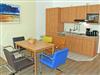 Im Wohnraum integrierte Einbauküche, ausgestattet mit: 2-Platten-Kochfeld, Dunstabzugshaube, großer Kühlschrank mit Gefrierfach, Geschirrspüler, Toaster, Kaffeemaschine, Wasserkocher und Küchenutensilien