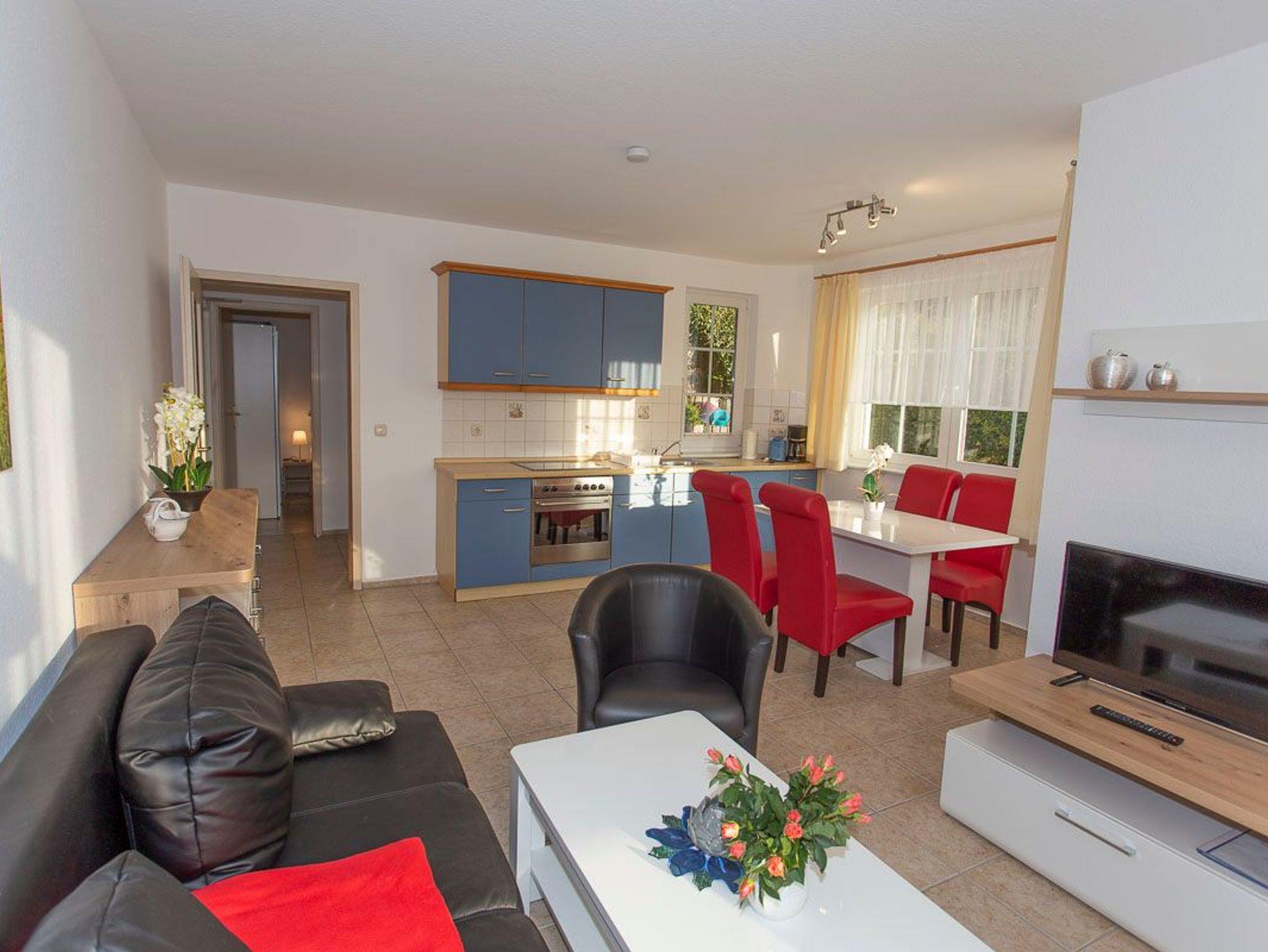 Die Zweiraumwohnung bestehend aus einem Wohnzimmer mit einer offenen Küchenzeile (Wasserkocher, Toaster, Ceranfeld, Backofen, Eierkocher), einem Schlafzimmer mit einem Doppelbett und einem Bad mit Dusche/WC.