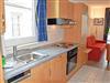 Im Wohnraum integrierte Einbauküche, ausgestattet mit: 4-Platten-Kochfeld, Backofen, Dunstabzugshaube, großer Kühlschrank mit Gefrierfach, Geschirrspüler, Toaster, Kaffeemaschine, Wasserkocher und Küchenutensilien
