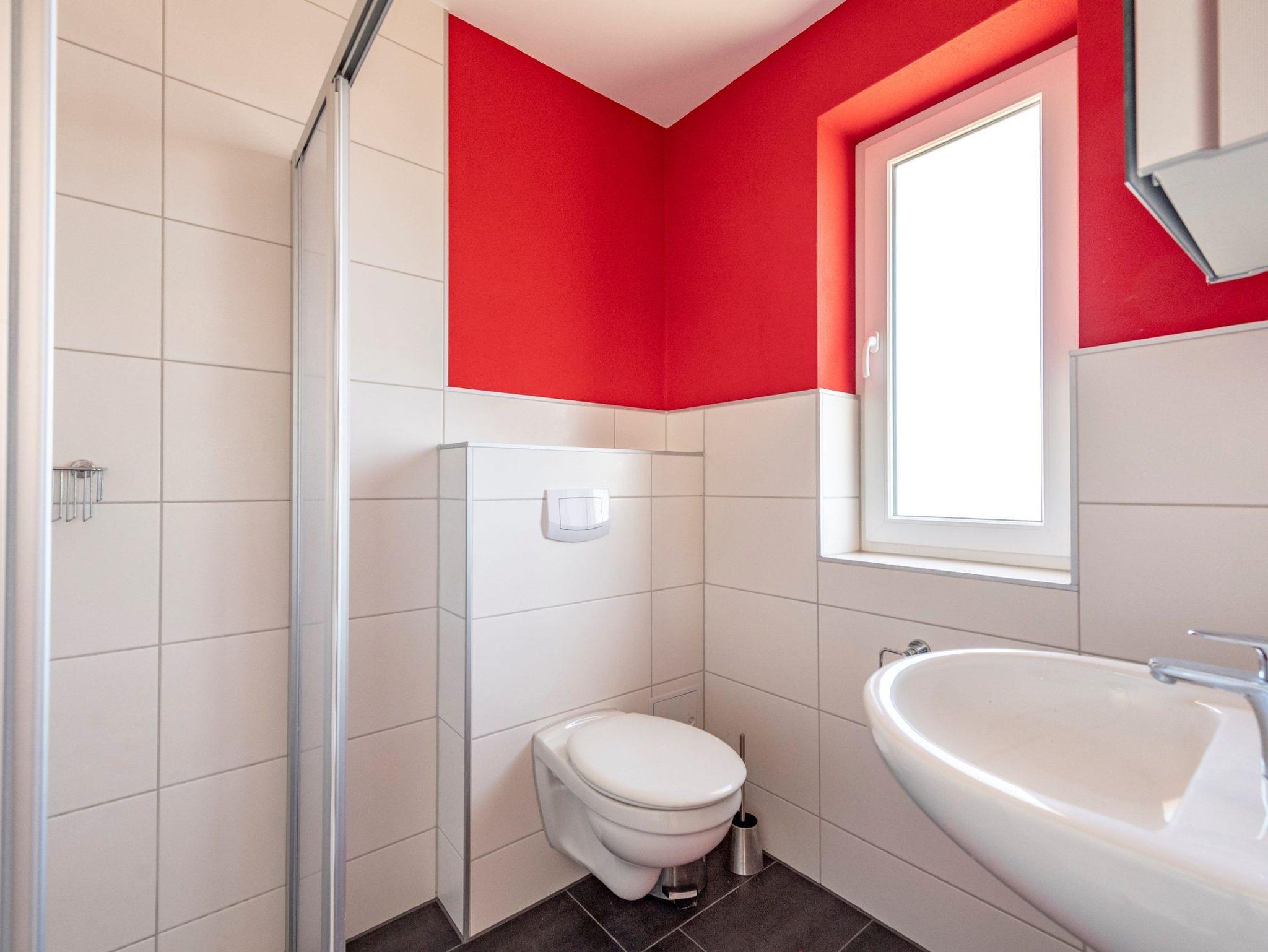 * Bad mit Dusche, WC, 1 Waschtisch mit Spiegel (mit Fenster)
