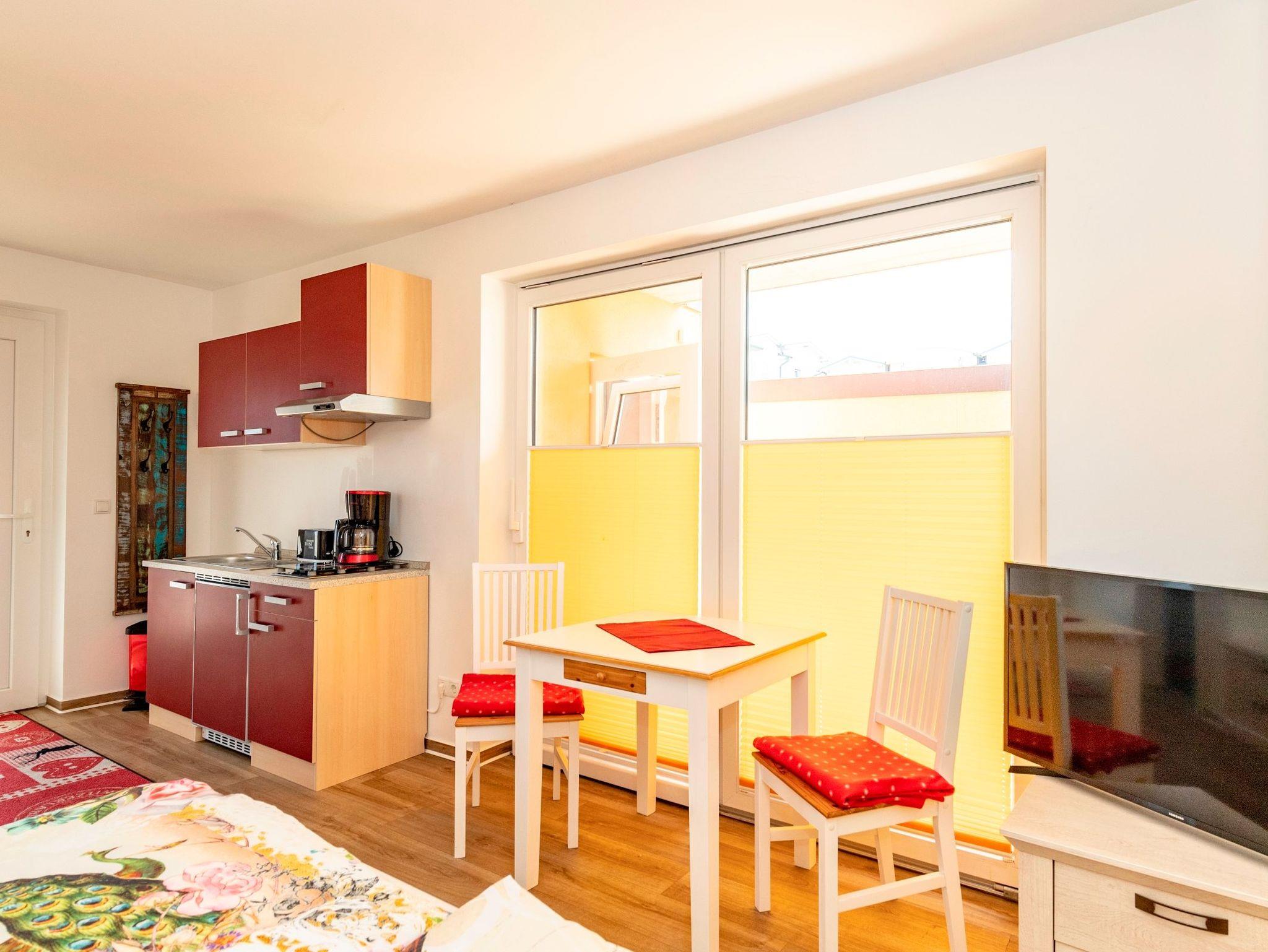 Unsere ruhig gelegenen, hellen und lichtdurchfluteten 1-Raum-Ferienwohnungen mit Terrasse sind wie folgt ausgestattet: