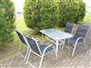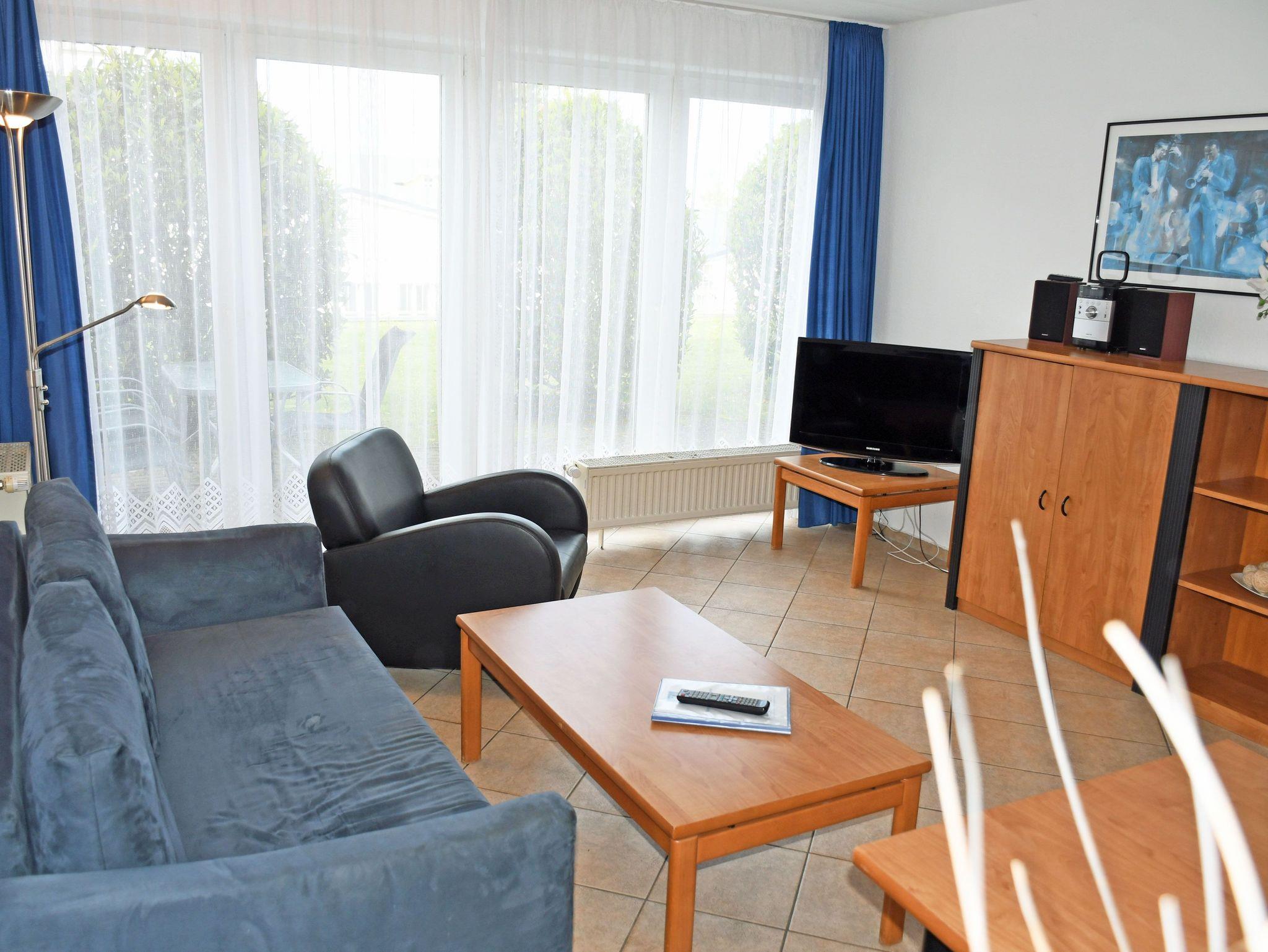 * Wohnbereich mit ausziehbarer, moderner Doppelbettschlafcouch (150 x 200 cm), 2 Sesseln, Couchtisch, Anrichte, Flat-TV, CD-Radio-Anlage und Esstisch mit 4 Stühlen