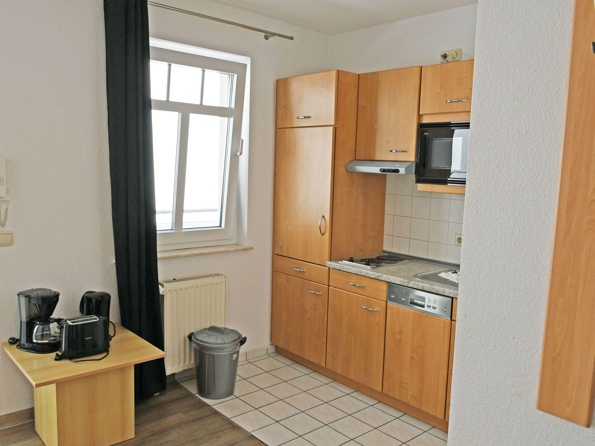 Im Wohnraum integrierte Einbauküche, ausgestattet mit: 2-Platten-Kochfeld, Dunstabzugshaube, großer Kühlschrank mit Gefrierfach, Geschirrspüler, Toaster, Kaffeemaschine, Wasserkocher und Küchenutensilien