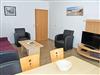 Wohnbereich mit ausziehbarer, moderner Doppelbettschlafcouch (168 x 200 cm), 2 Sesseln, Couchtisch, Anrichte mit Flat-TV (integr. Radiofunktion) und Esstisch mit 6 Stühlen