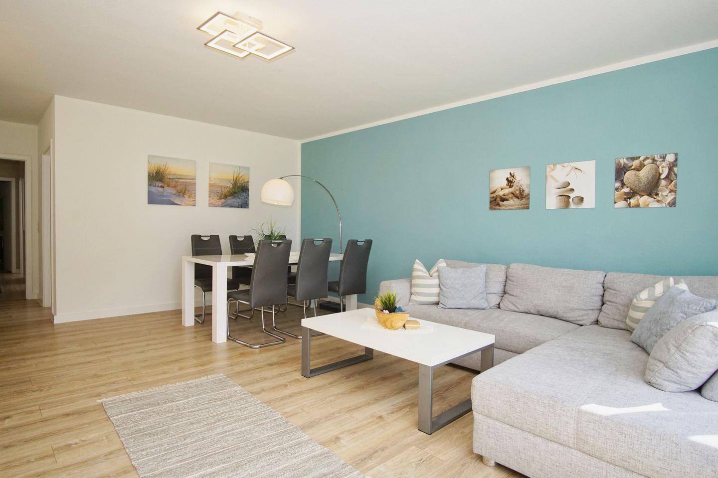 WOHNEN // Wohnraum mit Essbereich, Sitzgarnitur mit bequemer Couch und Schlaffunktion, Flachbild-TV ++