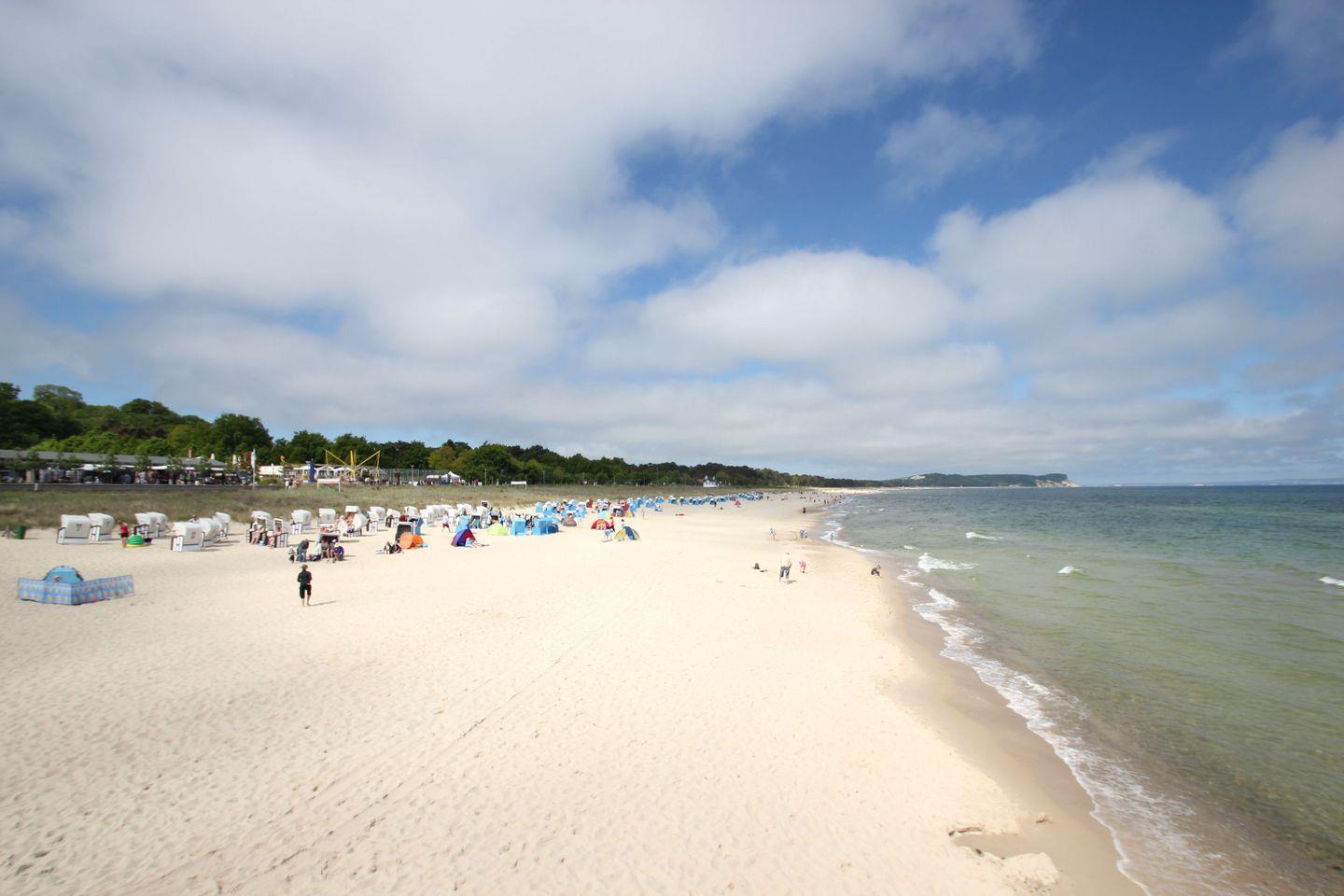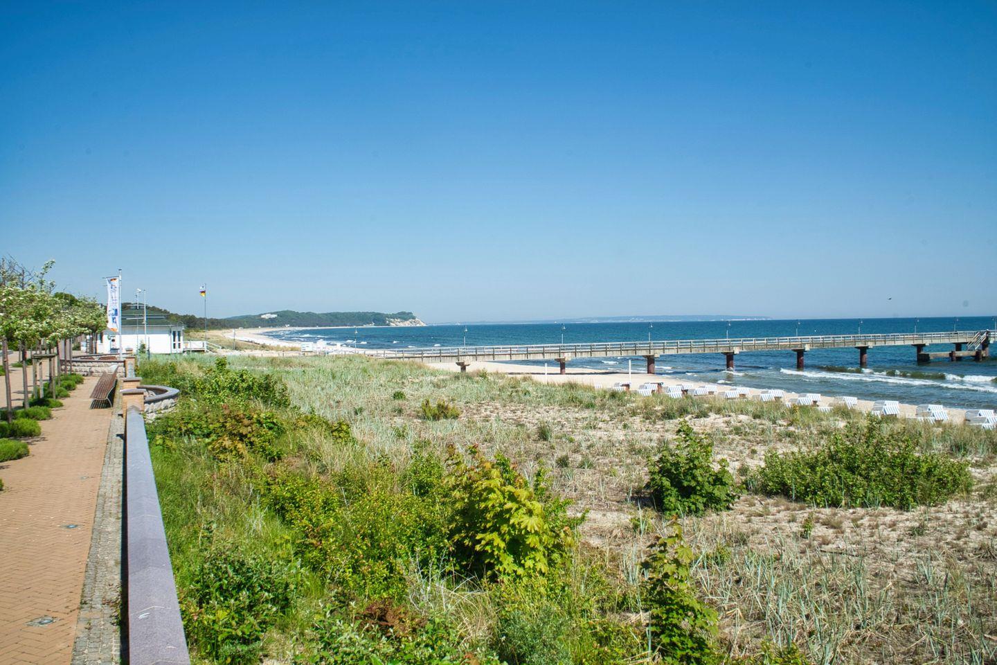 Der lange, feinsandige Nordstrand mit der Seebrücke sowie einer langen, romantischen Promenade, die bis zum nächsten Ostseebad Baabe führt, ist nach ca. 350 m Fußweg bequem erreicht.