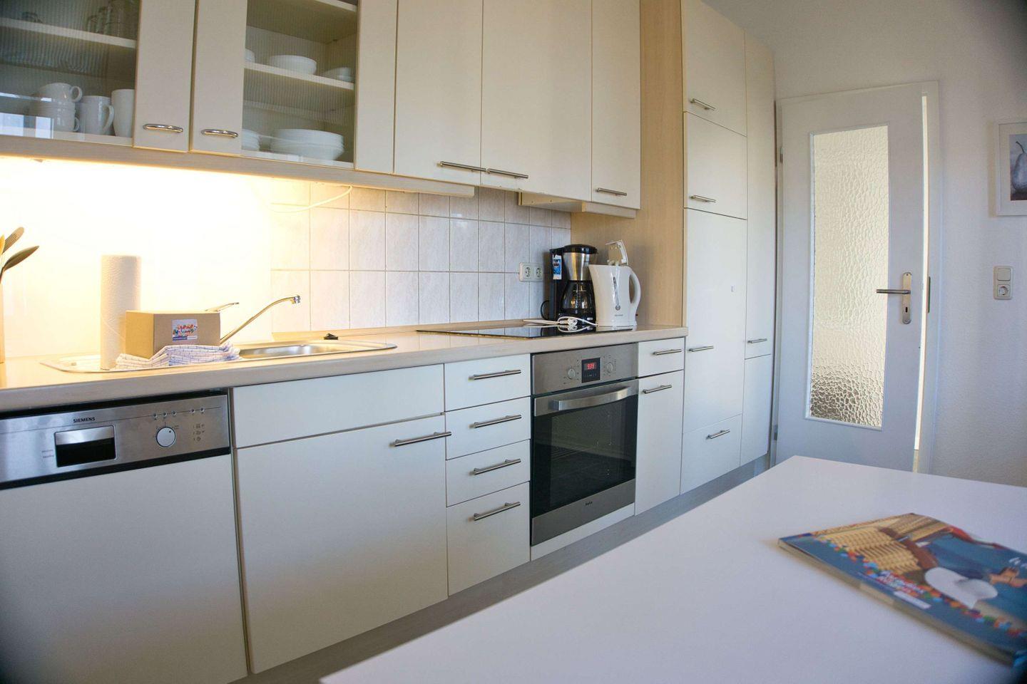 KÜCHE // Küchenzeile, 4-Platten Herd, Spülmaschine, Kühlschrank mit Gefrierfach, Backofen, Mikrowelle, Toaster, Wasserkocher, Kaffeemaschine, reichlich Besteck, Geschirr und Küchenutensilien sowie kleiner Sitzecke ++