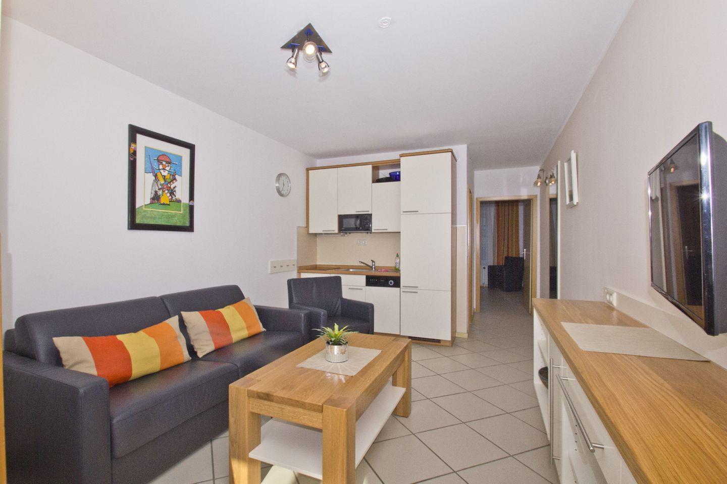 WOHNEN // Wohnraum mit Essbereich, Esstisch mit 4 Stühlen, Sitzgarnitur, Couch mit Schlaffunktion, Kabel-TV, Radio, CD-Player ++