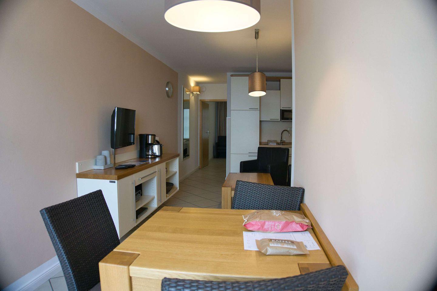 WOHNEN // Wohnraum mit Essbereich, Esstisch mit 4 Stühlen, Sitzgarnitur, Couch mit Schlaffunktion, Kabel-TV, Radio, CD-Player ++