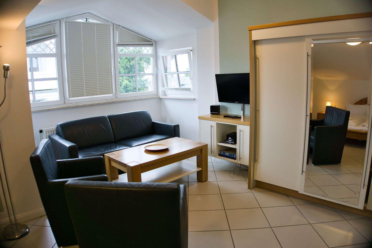 WOHNEN UND SCHLAFEN // Wohnraum mit Schlafbereich und Doppelbett, Essbereich mit Esstisch mit 3 Stühlen, Sitzgarnitur, Kabel-TV, Radio, CD-Player ++