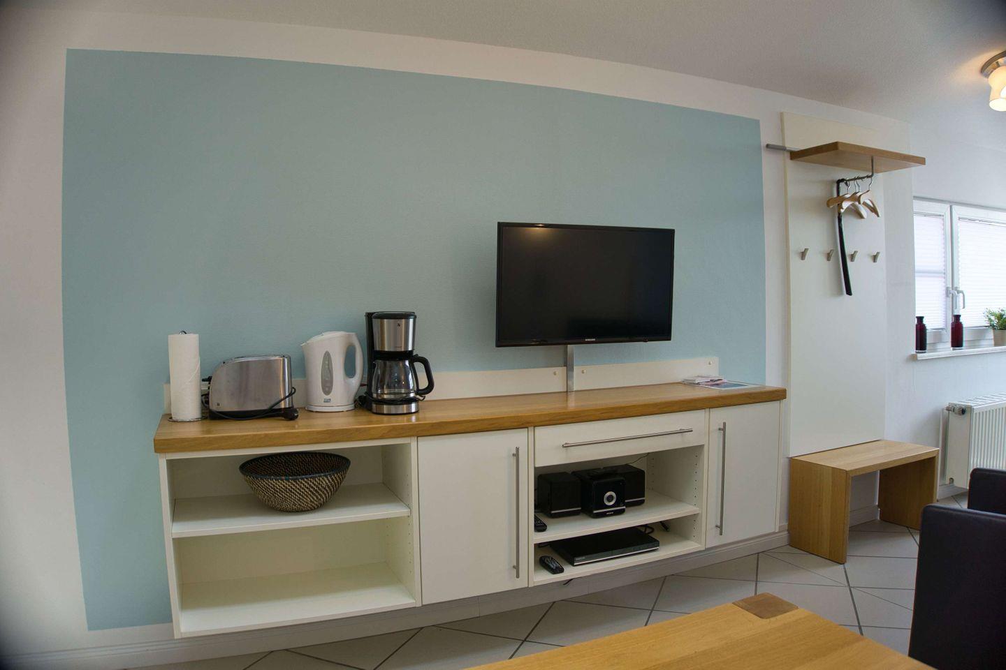 WOHNEN // Wohnraum mit Essbereich, Esstisch mit 4 Stühlen, Sitzgarnitur, Couch mit Schlaffunktion, Kabel-TV, Radio, CD-Player ++