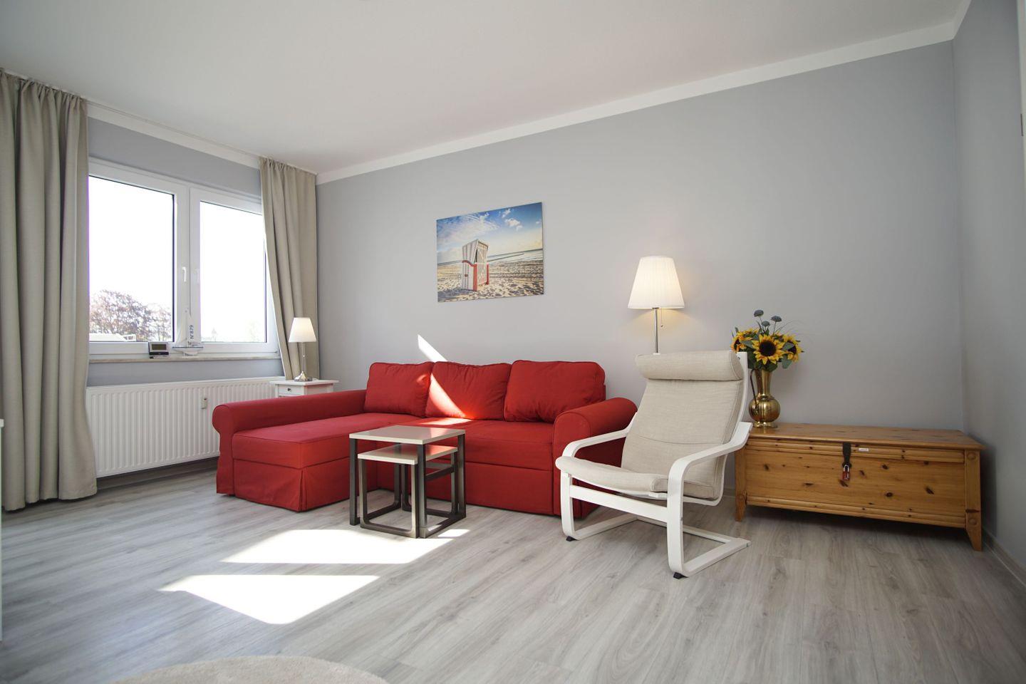 WOHNEN // Wohnraum mit Essbereich, Sitzgarnitur mit bequemer Schlafcouch, Flachbild-TV (Kabel), CD-Radio, Safe ++