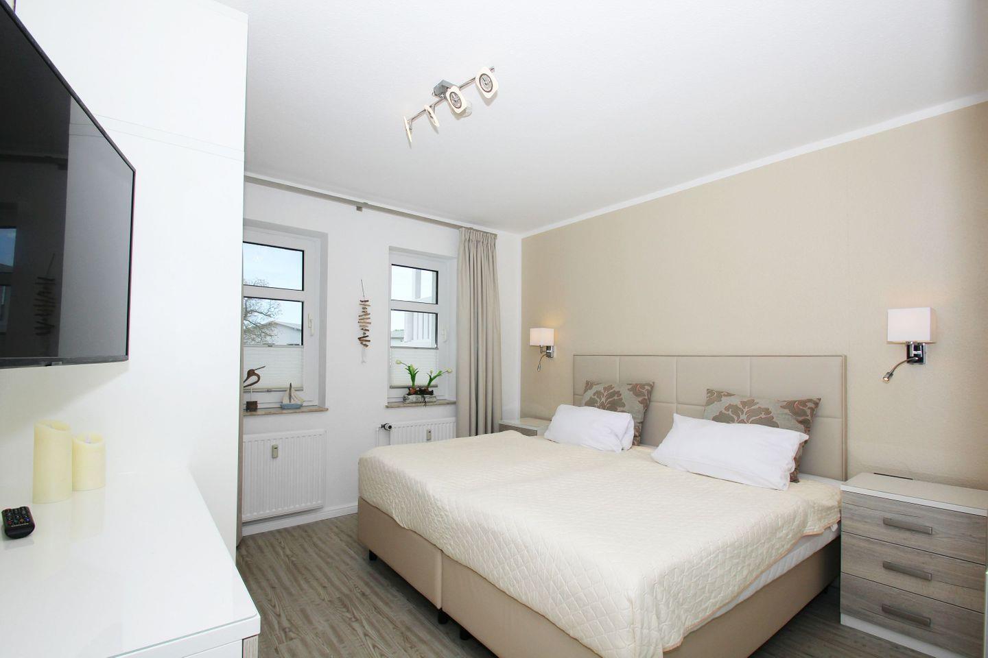 SCHLAFEN // ein Schlafzimmer mit bequemem Doppelbett, Kleiderschrank und Flachbild-TV ++