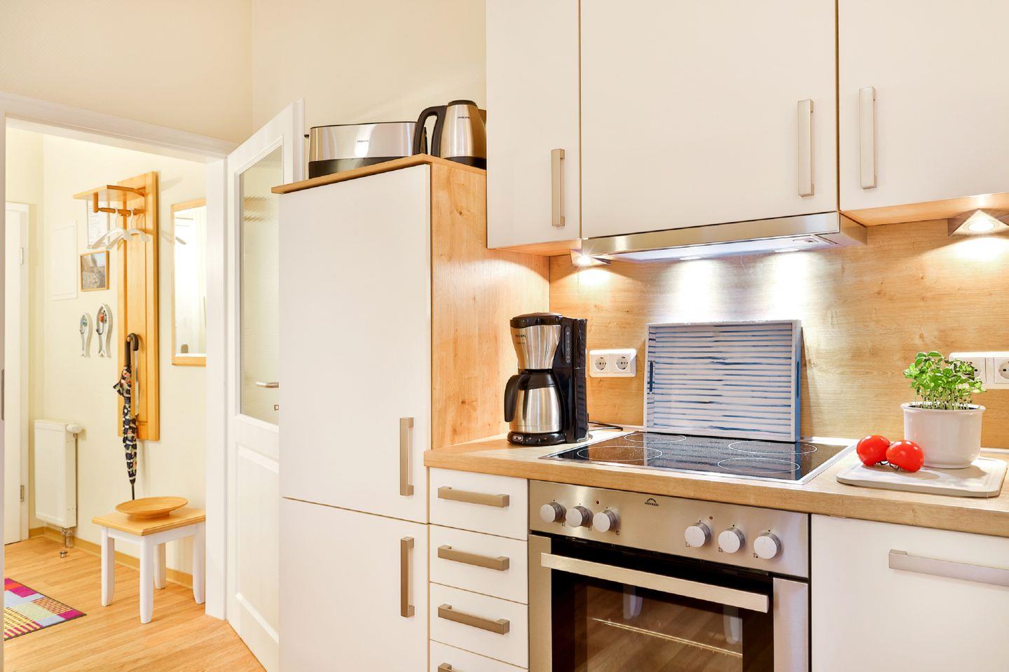 KÜCHE // Küchenzeile, Ceranfeld, Spülmaschine, Kühlschrank mit Gefrierfach, Backofen, Mikrowelle, Toaster, Wasserkocher, Kaffeemaschine, reichlich Besteck, Geschirr und Küchenutensilien ++
