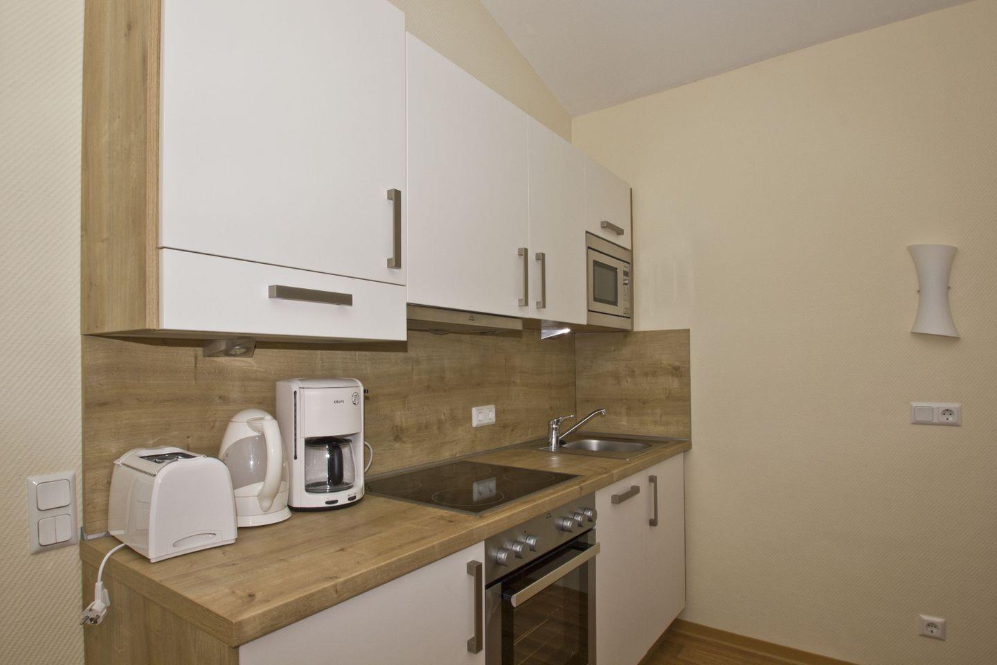KÜCHE // Küchenzeile, 4-Platten-Herd, Spülmaschine, Kühlschrank mit Gefrierfach, Backofen, Toaster, Wasserkocher, Kaffeemaschine, reichlich Besteck, Geschirr und Küchenutensilien ++