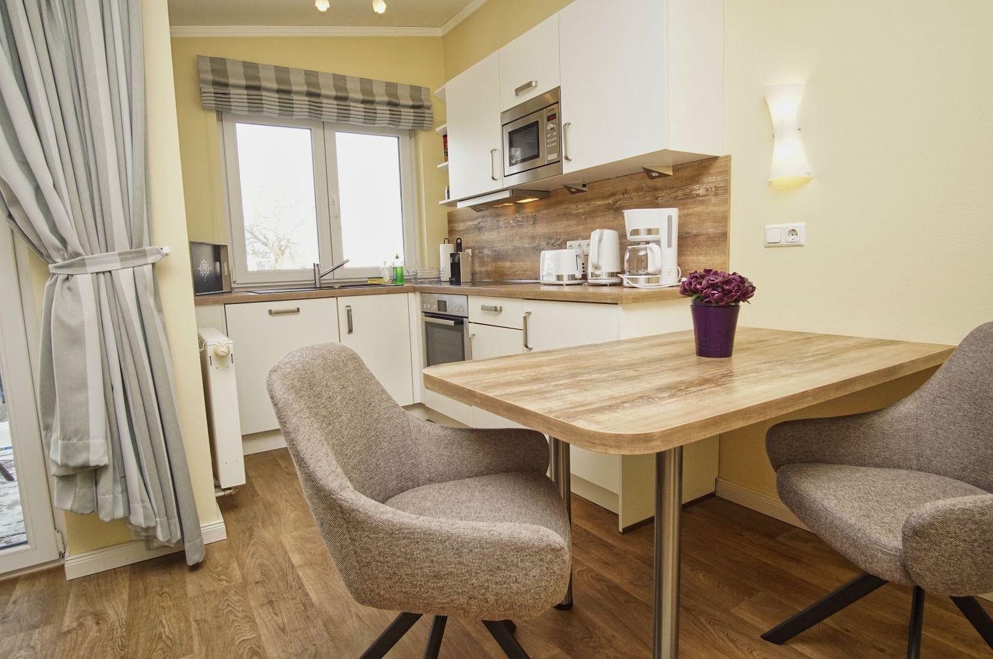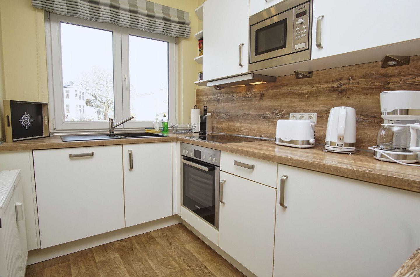 KÜCHE // Küchenzeile, Cerankochfeld (4-Platten), Spülmaschine, Kühlschrank mit Gefrierfach, Backofen, Mikrowelle, Toaster, Wasserkocher, Kaffeemaschine, reichlich Besteck, Geschirr und Küchenutensilien ++