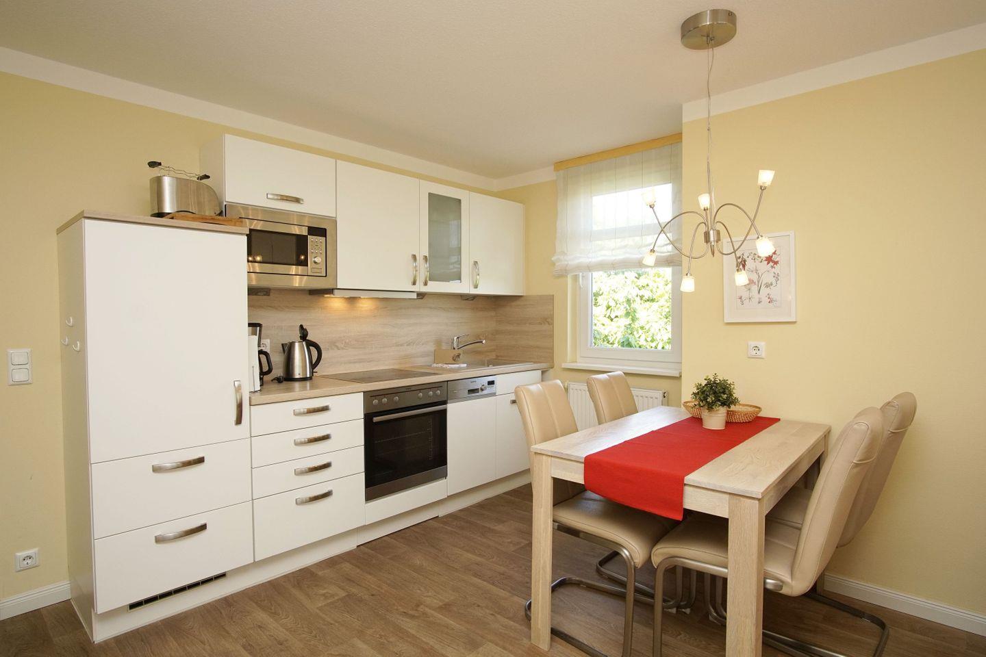 KÜCHE // Küchenzeile, 4-Platten-Herd, Spülmaschine, Kühlschrank mit Gefrierfach, Backofen, Mikrowelle, Toaster, Wasserkocher, Kaffeemaschine, reichlich Besteck, Geschirr und Küchenutensilien ++