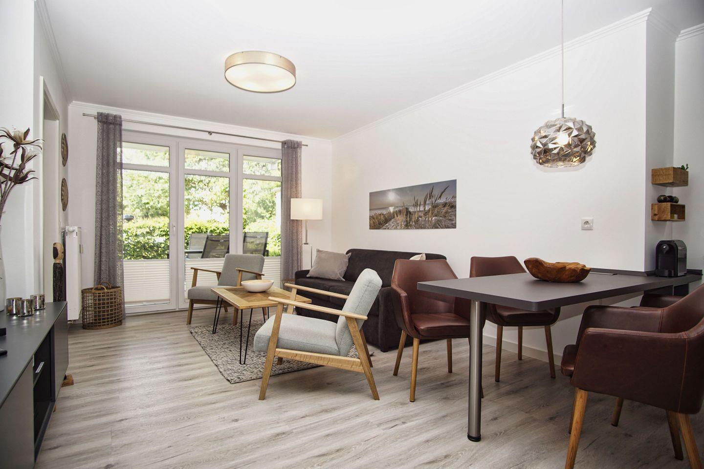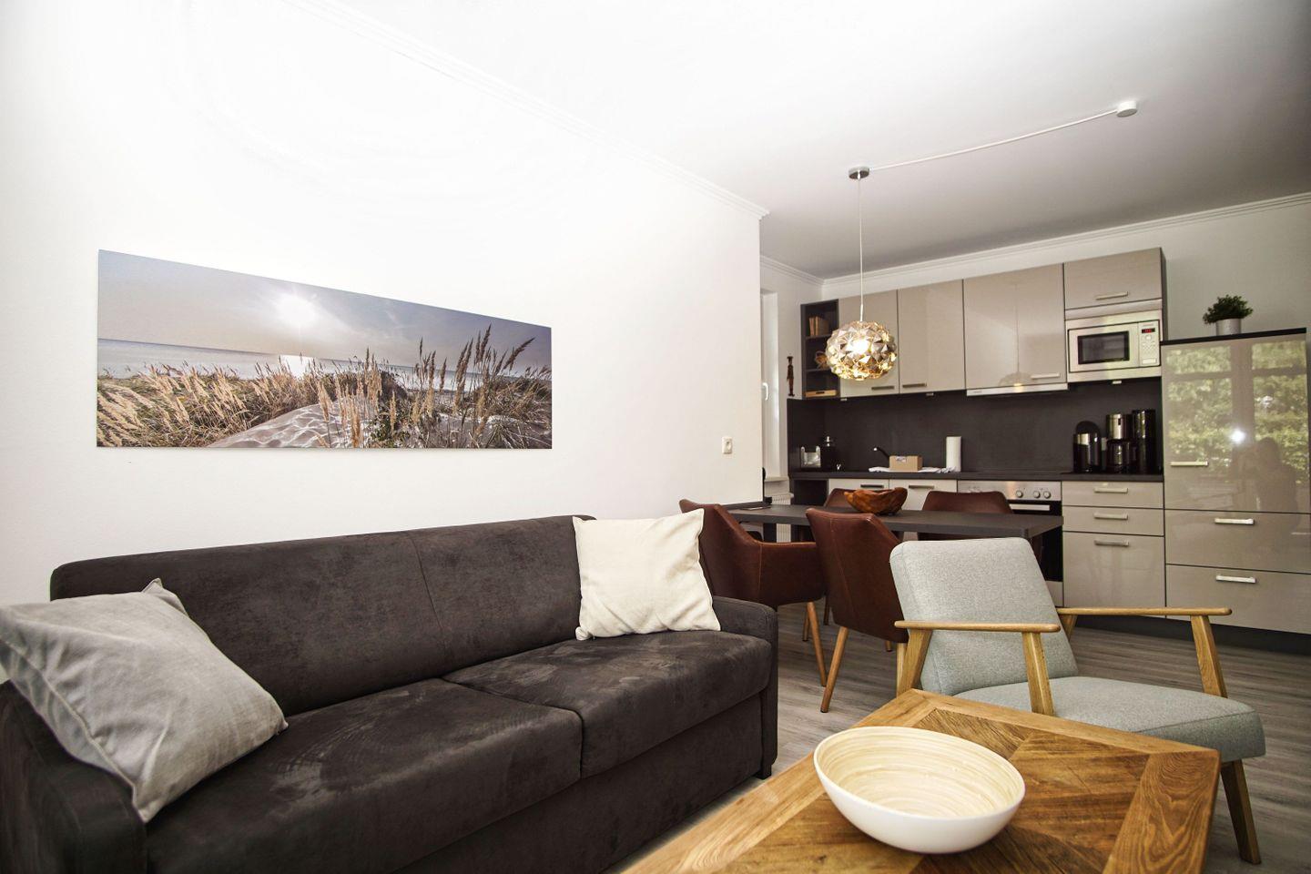 WOHNEN // Wohnraum mit Essbereich, Sitzgarnitur mit bequemer Schlafcouch, Kabel-TV, Zugang zur Terrasse ++
