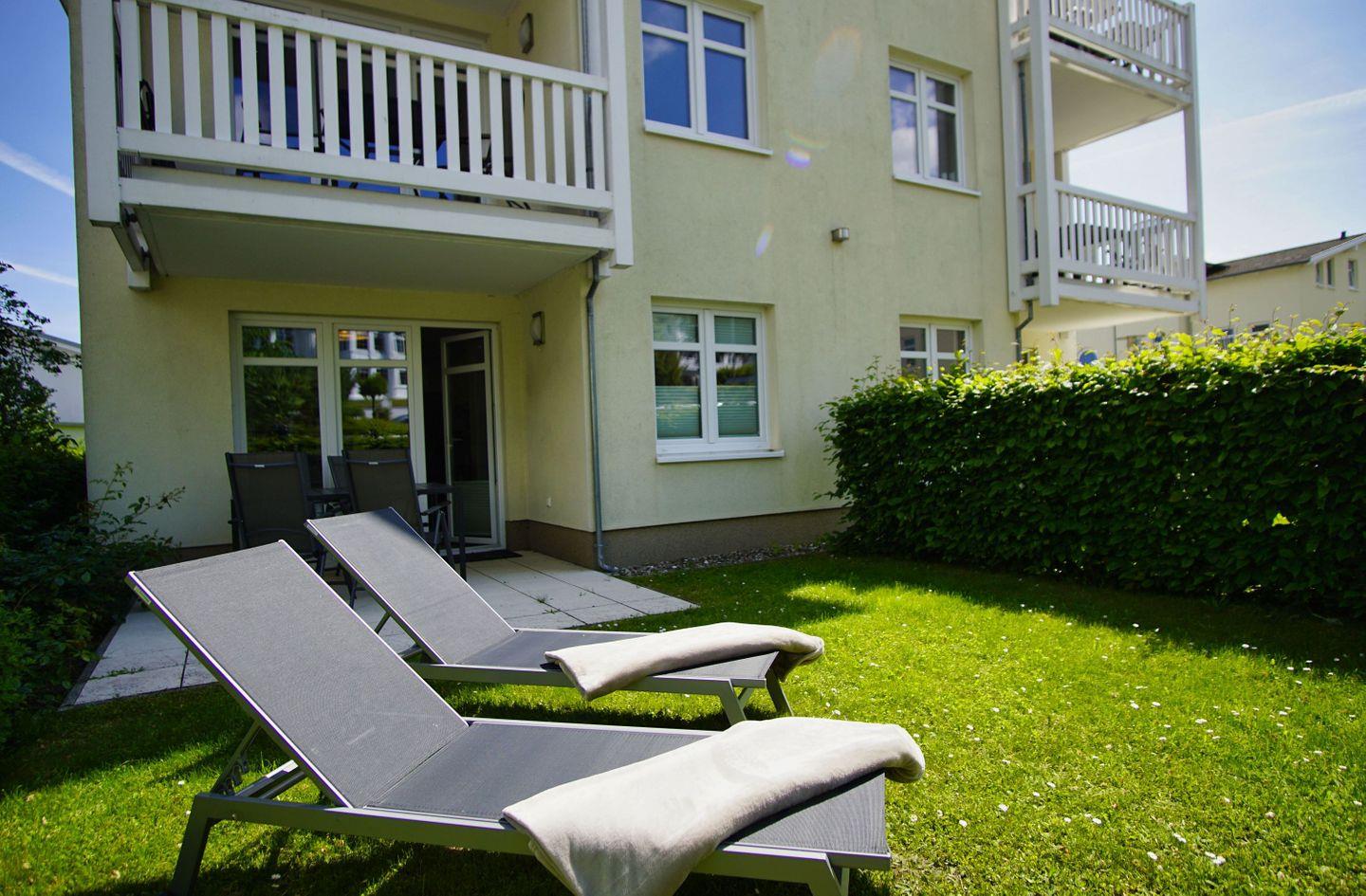 Die gepflegte, von großzügigen Rasenflächen eingefasste Anlage liegt in einer ruhigen Seitenstraße des Ostseebades Göhren.