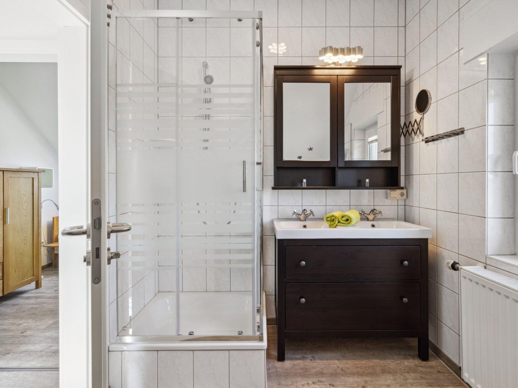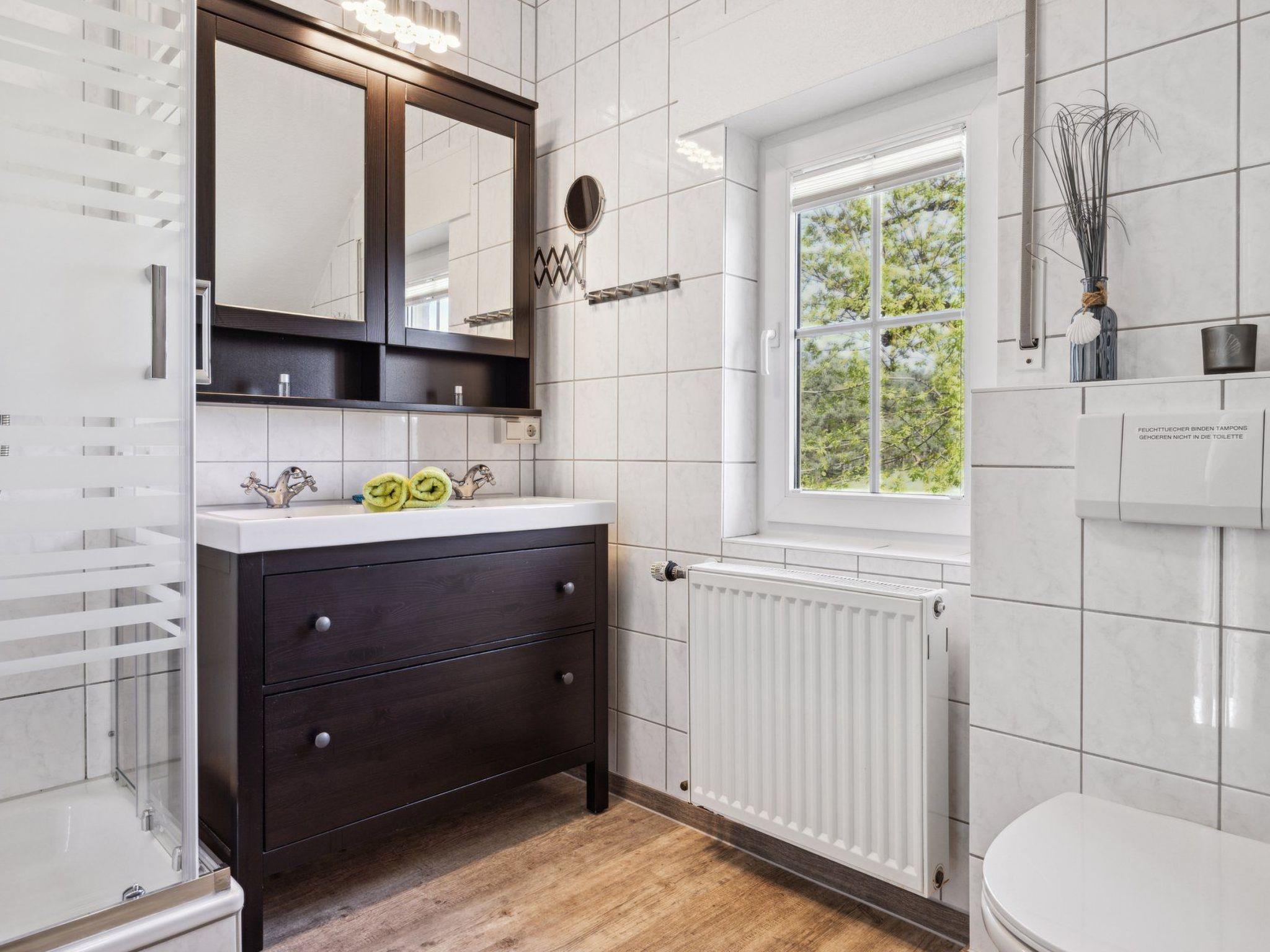 In addition, there is a modern bathroom with a shower, double vanity and window, as well as a separate guest toilet.