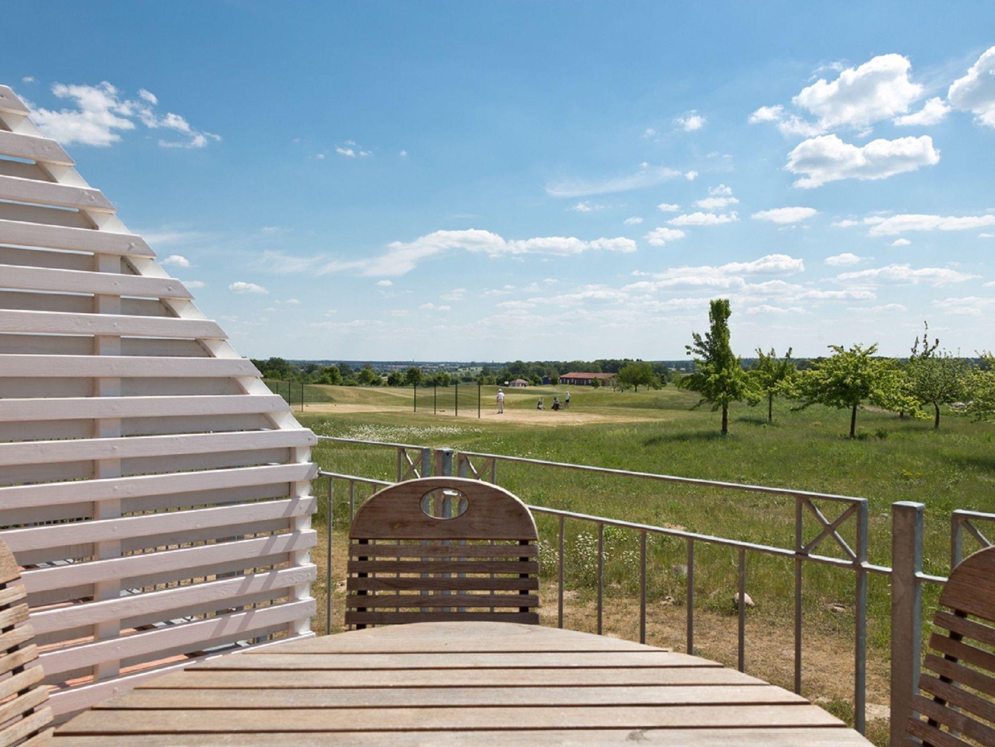 Die große Balkon mit ihrem schönen Ausblick über den Golfplatz. Der Fleesensee liegt in Untergöhren uns ist ungefähr 20 Gehminuten entfernt.