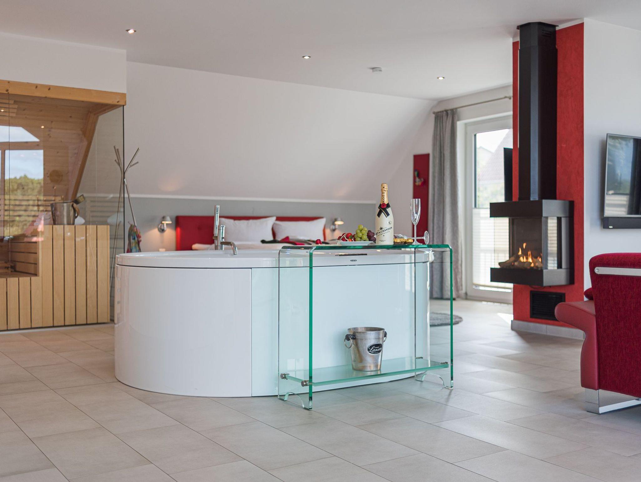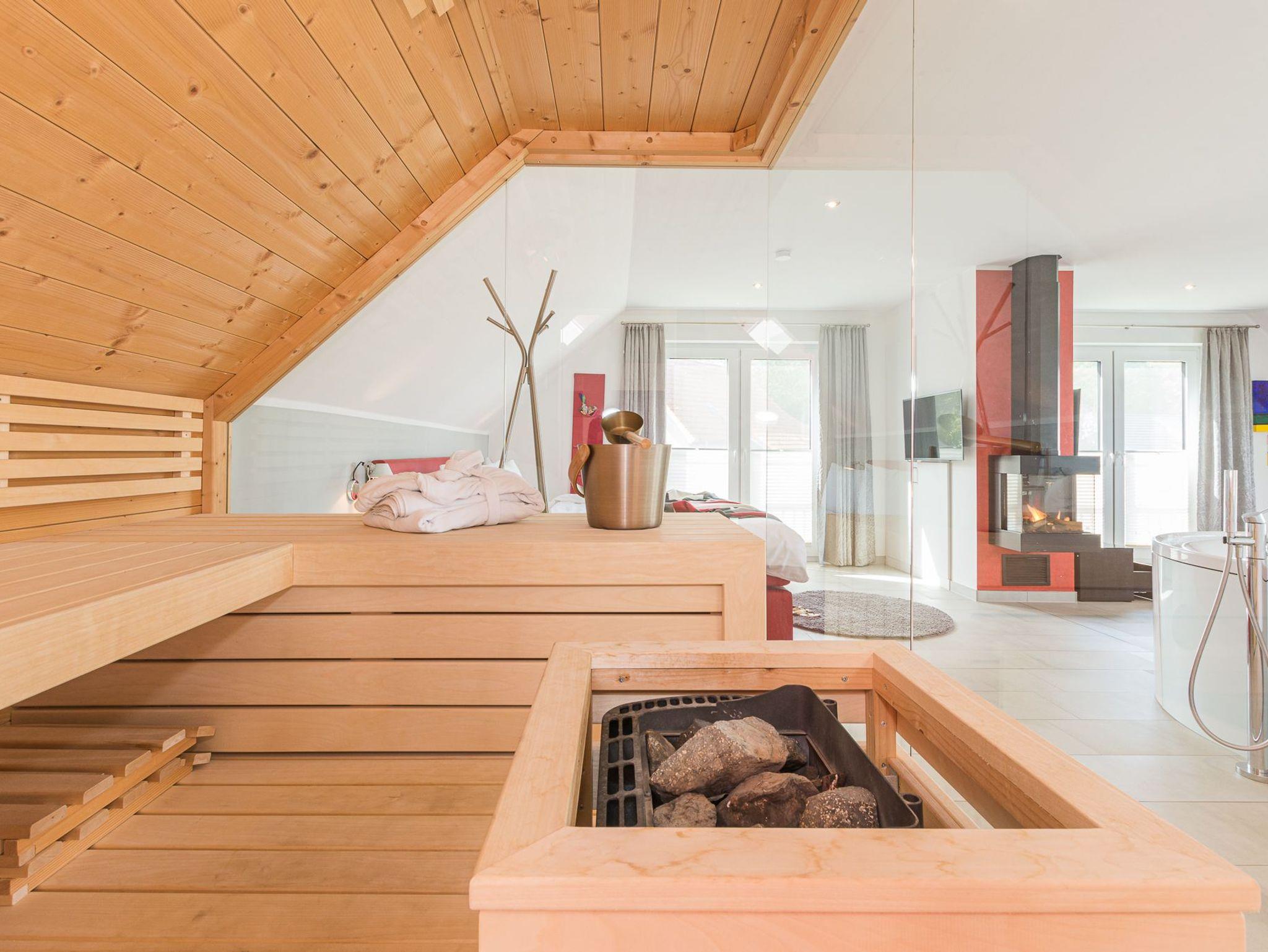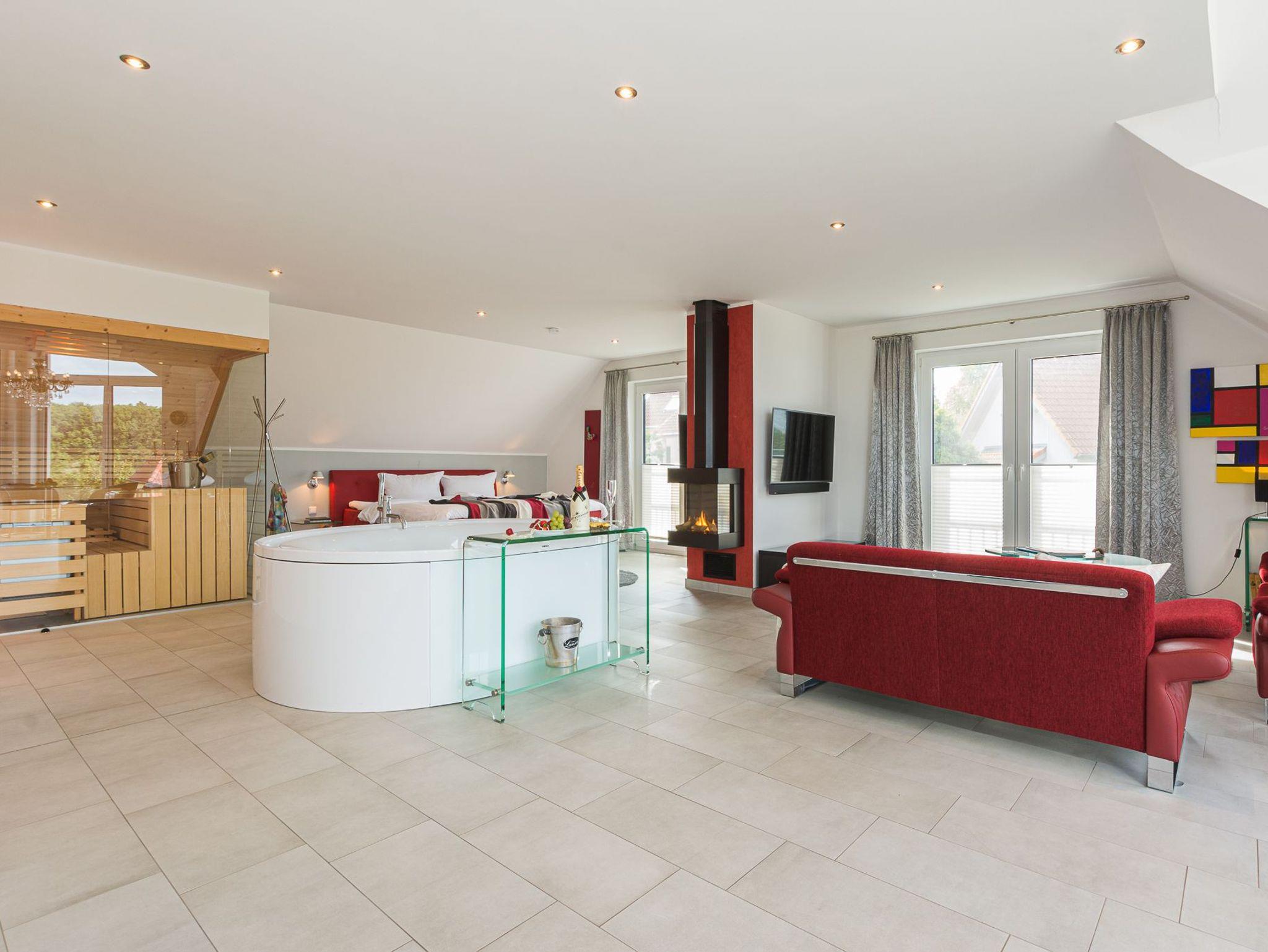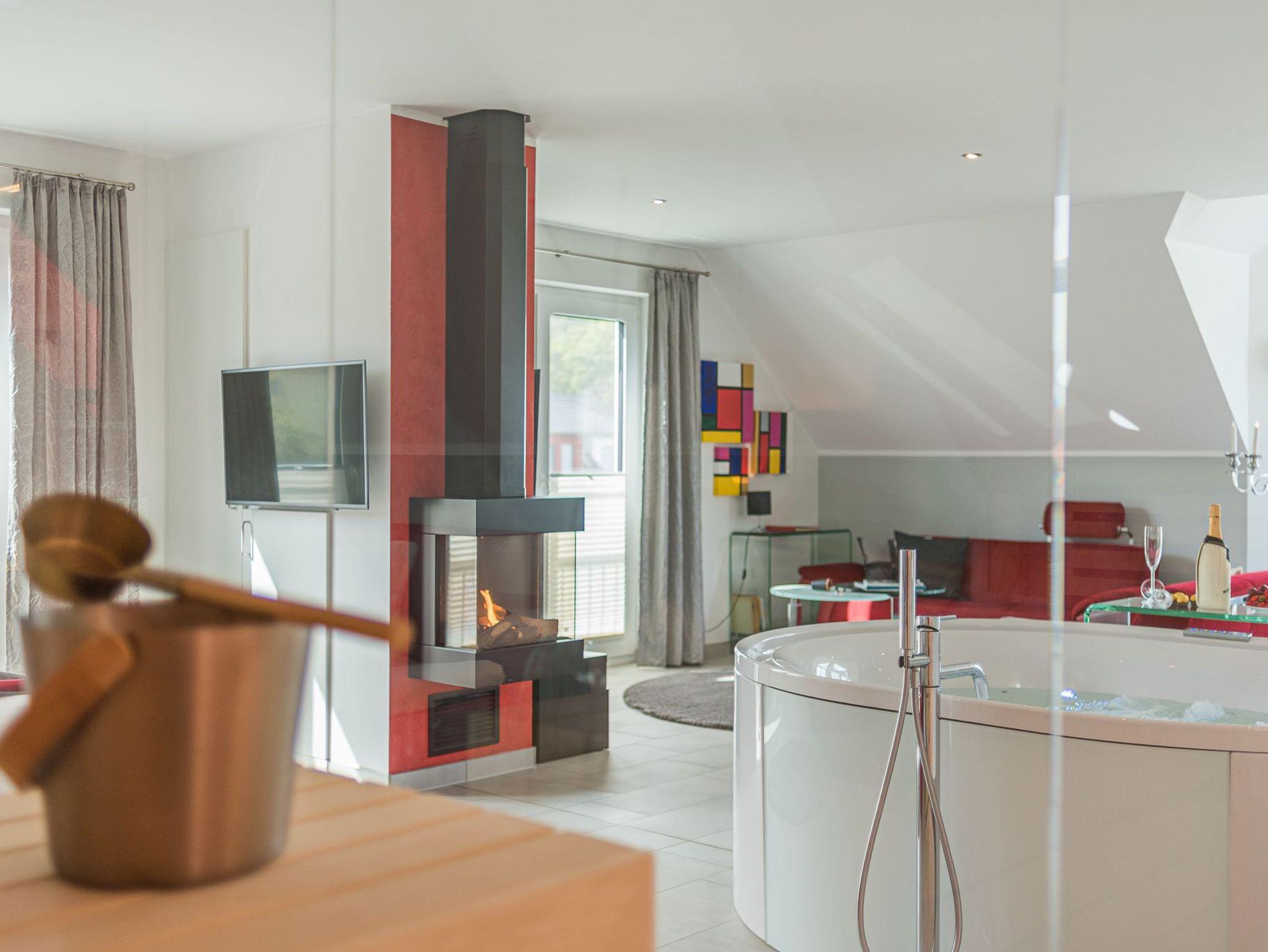 Mit großzügigen 78 m² Wohnfläche bietet diese Suite einen Rückzugsort. Der offene Schlafbereich schafft eine romantische Atmosphäre. Der offene Wohn- und Essbereich mit einem gemütlichen Gas-Kamin bietet Ihnen eine behagliche Umgebung, um entspannte Stunden zu verbringen. Die Küche ermöglicht es Ihnen, Ihre kulinarischen Vorlieben auszuleben und sich gegenseitig zu verwöhnen. Das moderne Badezimmer bietet ein absolutes Highlight mit der vollverglasten Sauna, die Ihnen pure Entspannung und Erholung bietet. Der Indoor-Whirlpool mit LED-Beleuchtung verspricht romantische Momente und verwöhnt Sie. Hier können Sie gemeinsam entspannen und die Zeit zu zweit in vollen Zügen genießen.