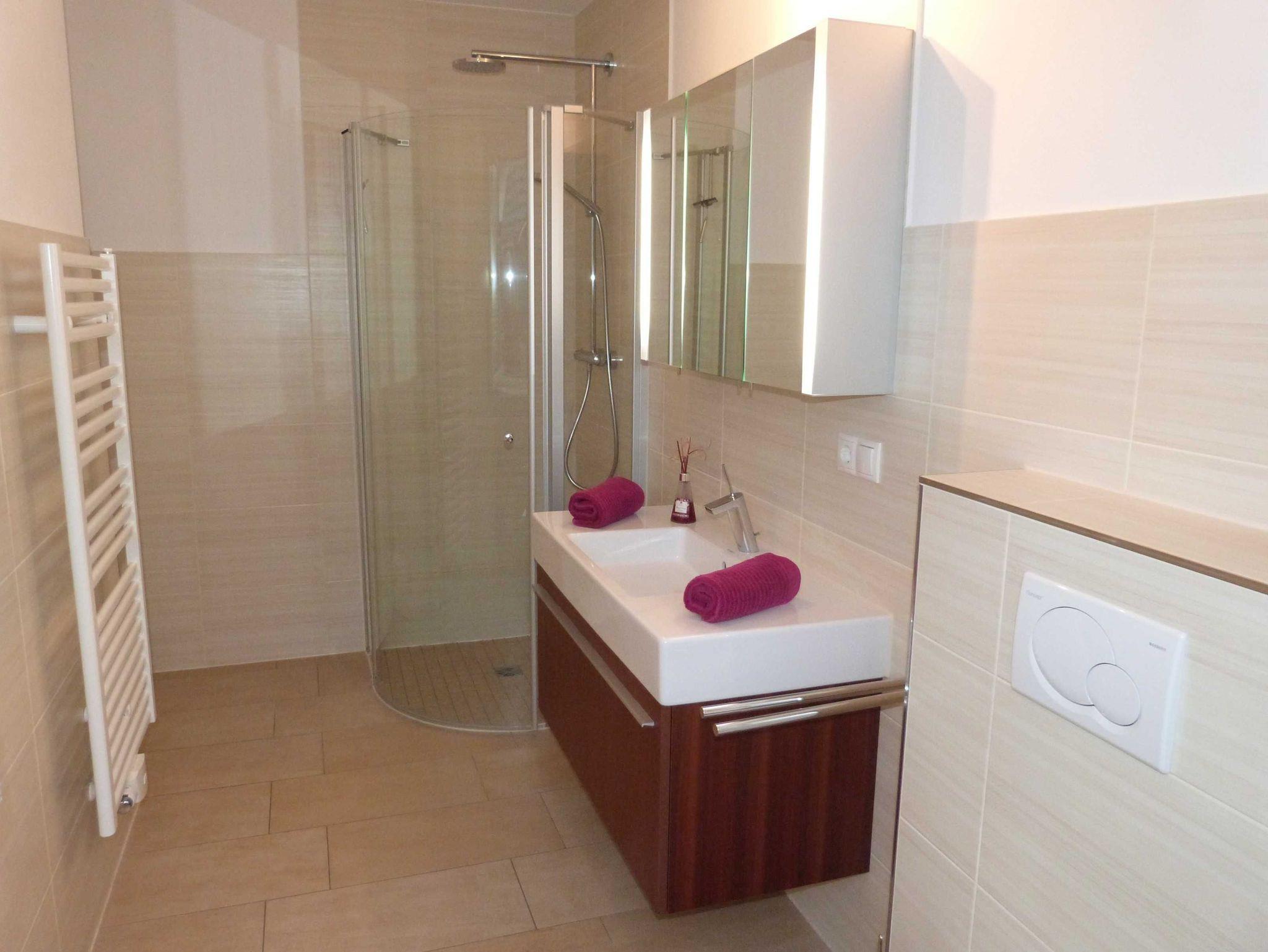 ebenerdigen Dusche samt Regenbrause, sowie ein kleineres mit Badewanne.