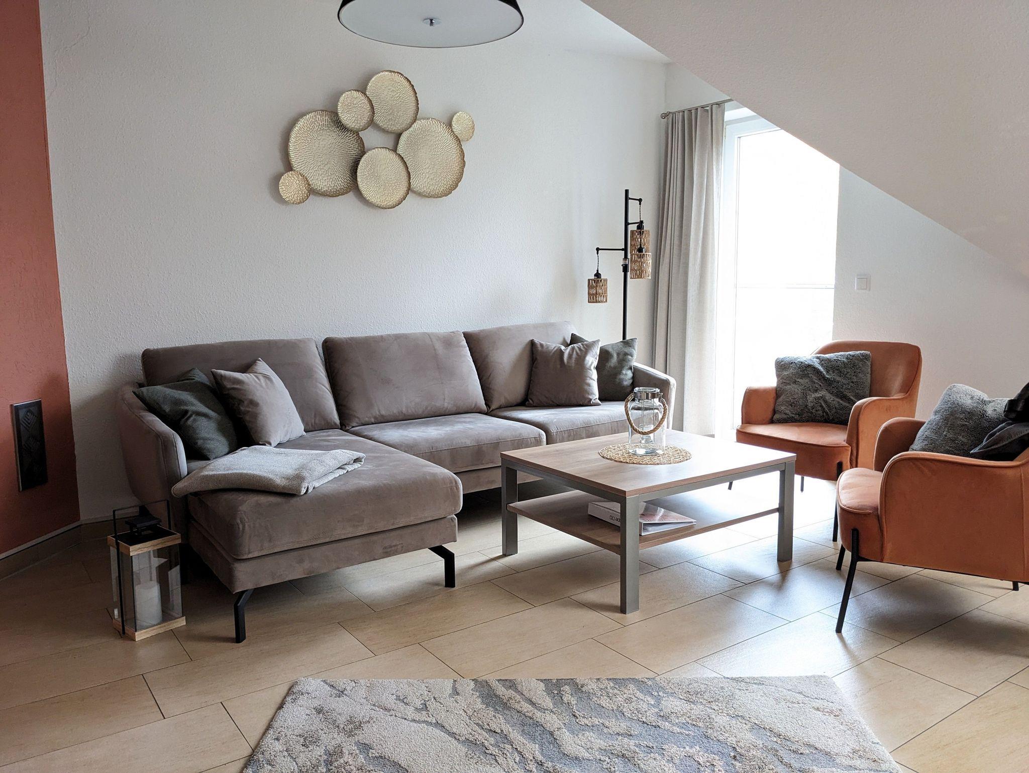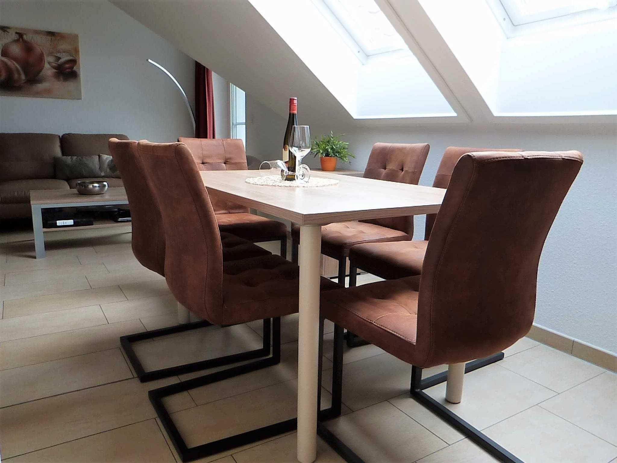 hellen, großzügigen Wohn-/Essbereich befindet sich ein Esstisch für 6