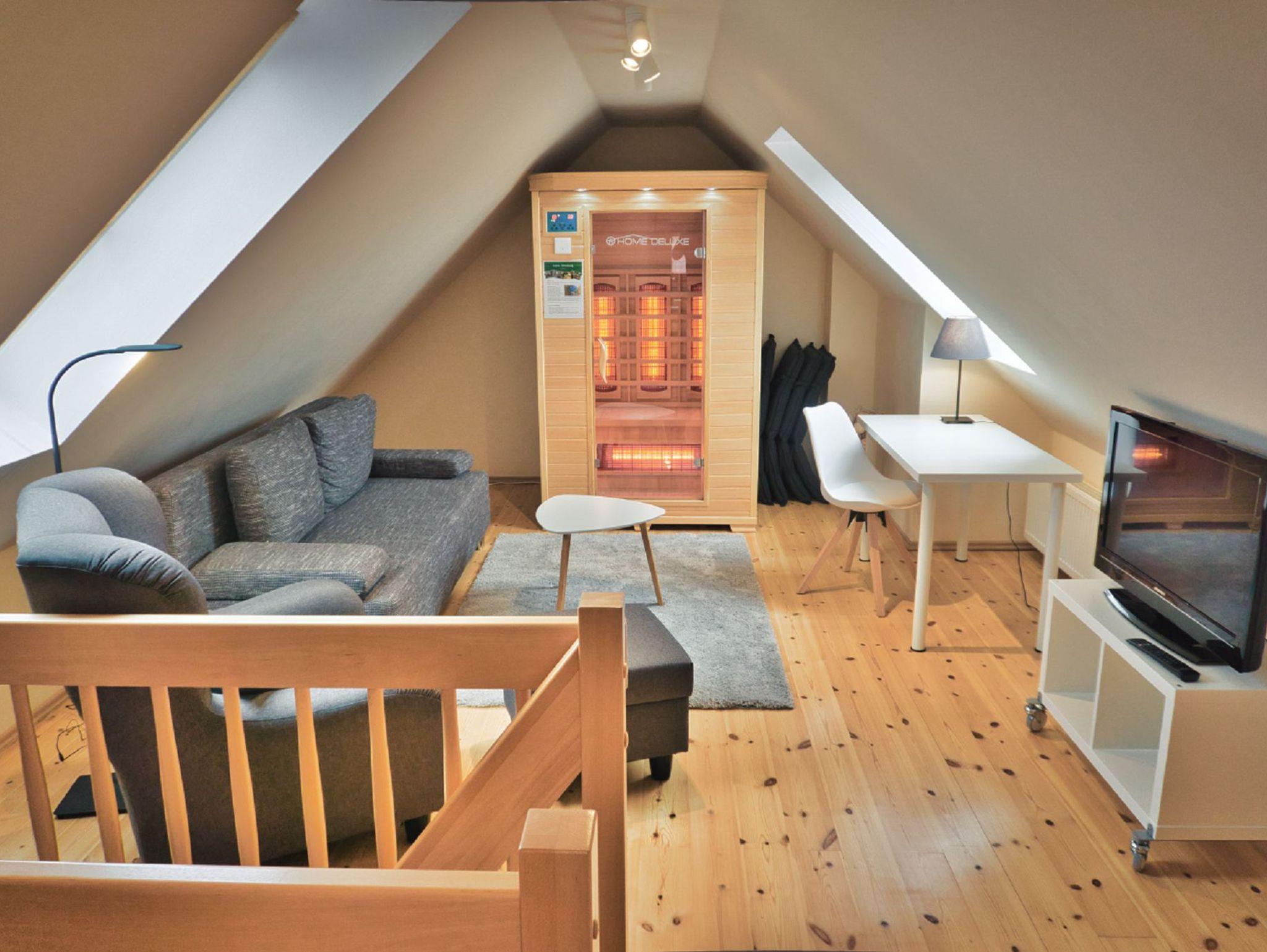 Der erweiteter Aufenthaltsbereich im ausgebauten Spitzboden bietet Ihnen mit einer Vollspektruminfrarot-Sauna (Wärme dringt binnen kurzer Zeit tief in den Körper ein und beeinflusst positiv den Stoffwechsel sowie die Muskulatur, der Körper entschlackt, Giftstoffe scheidet er aus. Gewinnbringend ist natürlich auch die psychische und physische Entspannung). Hier können Sie sich danach auf dem (Schlaf-) Sofa erholen. Ebenfalls befindet sich dort ein TV und Schreibtisch sowie eine sep. Toilette mit Waschbecken im Spitzboden.