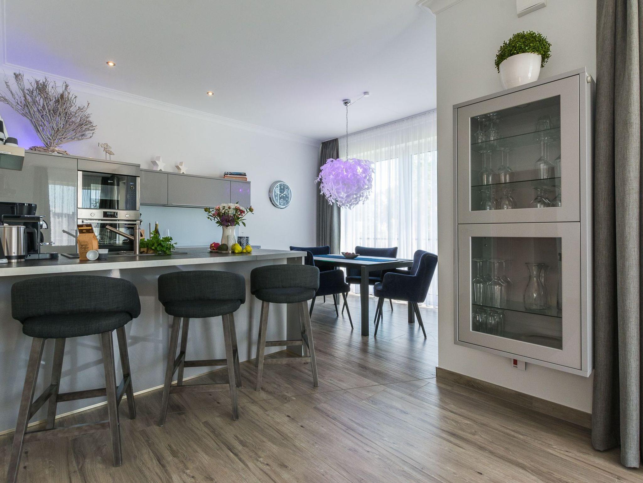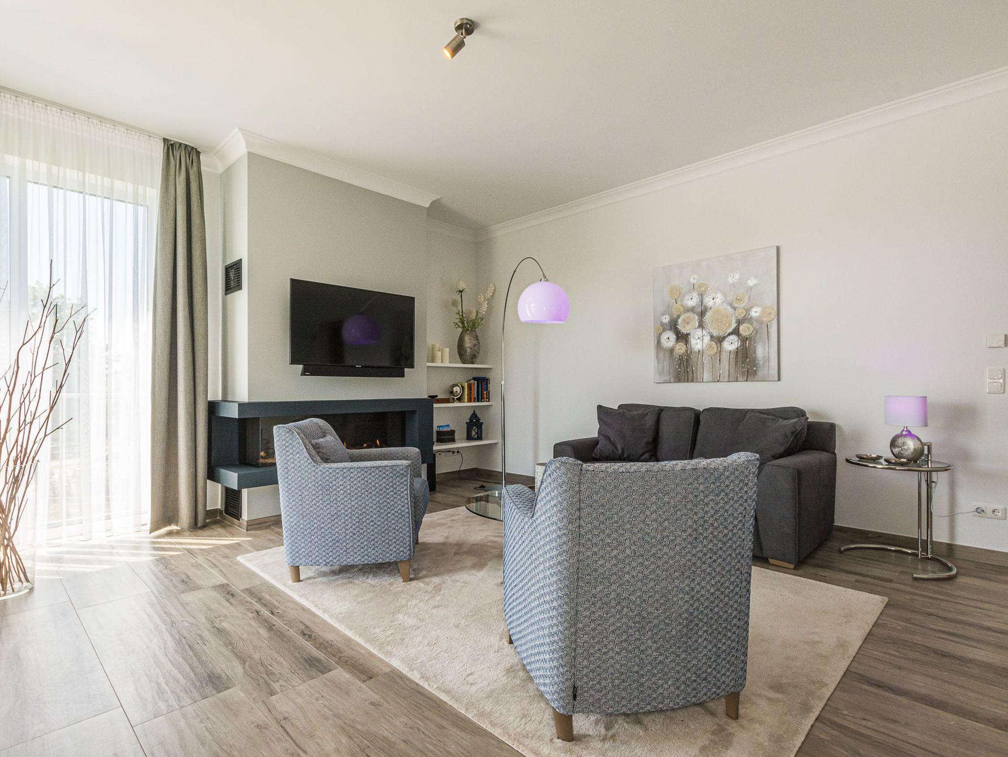 Auf 125 m² Wohnfläche erwartet Sie ein offener Wohn- und Essbereich, der im maritimen Stil gestaltet ist und eine einladende Atmosphäre schafft. Der Gas-Kamin sorgt für gemütliche Stunden und trägt zur maritimen Wohlfühlatmosphäre bei. Die zwei Schlafzimmer sind liebevoll gestaltet und bieten Ihnen erholsame Nächte, damit Sie Ihren Urlaub voll auskosten können. Die zwei Badezimmer sind modern und elegant ausgestattet, eines davon verwöhnt Sie mit einer entspannenden Sauna.