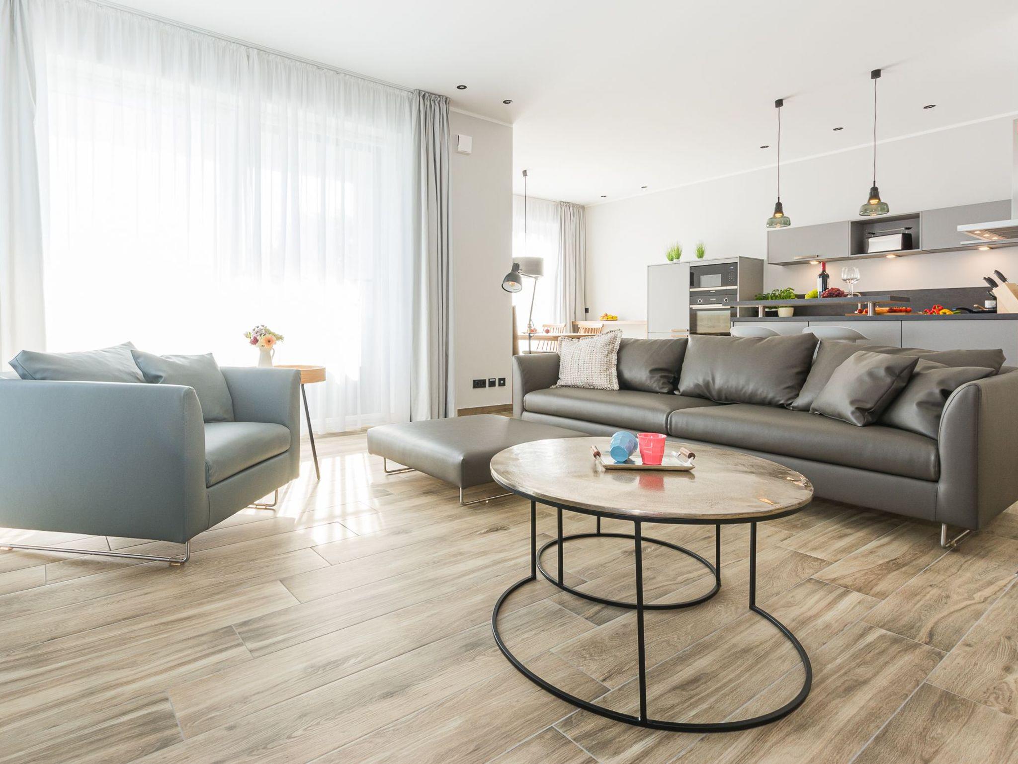 Die 125 m² Wohnfläche dieses exquisiten Quartiers bieten Ihnen viel Platz zum Wohlfühlen und Entspannen. Der offene Wohn- und Essbereich mit einem gemütlichen Gas-Kamin lädt zum Verweilen und Genießen ein. Hier können Sie gemütliche Abende verbringen und die behagliche Atmosphäre genießen. Die beiden Badezimmer sind modern und elegant gestaltet. Beide verfügen über bodengleiche Duschen, die Ihnen ein angenehmes Duscherlebnis bieten. Eines der Badezimmer ist mit einer Sauna ausgestattet, in der Sie sich nach einem aktiven Tag herrlich erholen können. Die beiden Schlafzimmer sind stilvoll eingerichtet und versprechen erholsame Nächte, damit Sie gut ausgeruht in den nächsten Tag starten können.