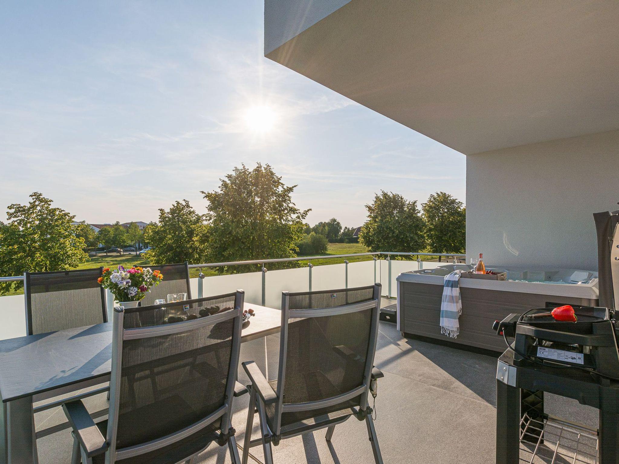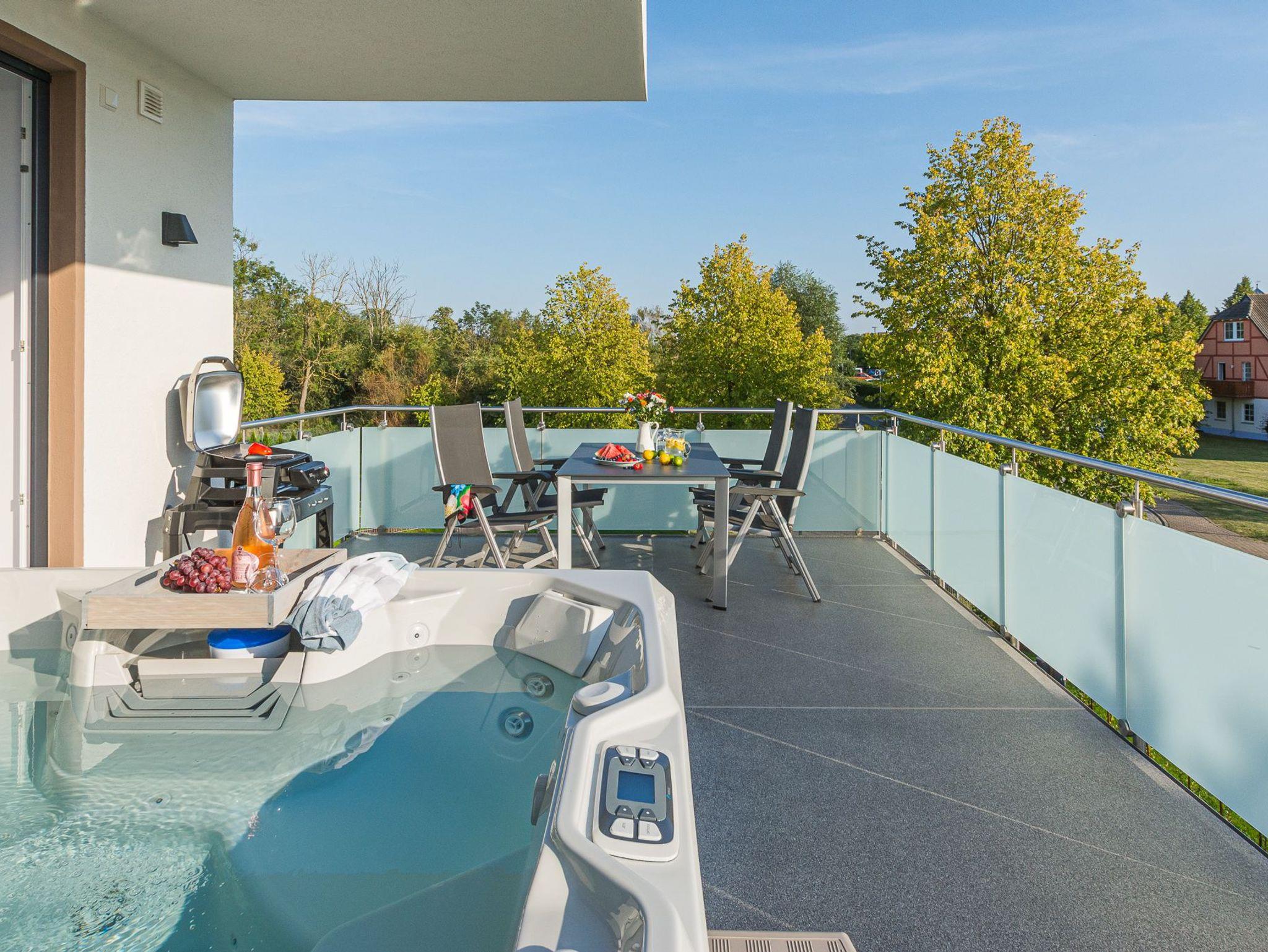 Ein absolutes Highlight ist der große Balkon, auf dem Sie den Blick auf die Umgebung genießen können. Hier erwartet Sie zudem ein Außen Whirlpool, in dem Sie sich bei sprudelndem Luxus entspannen können.
