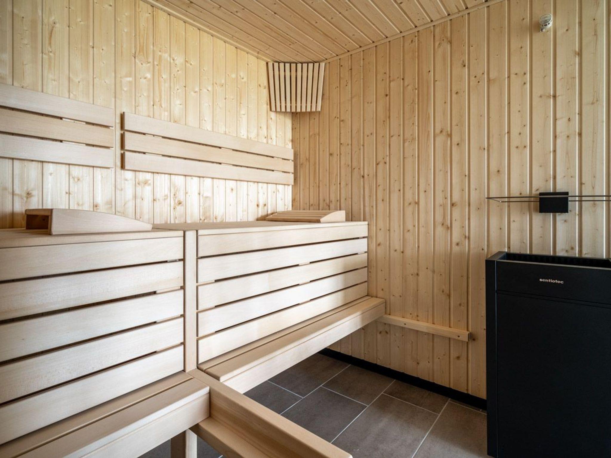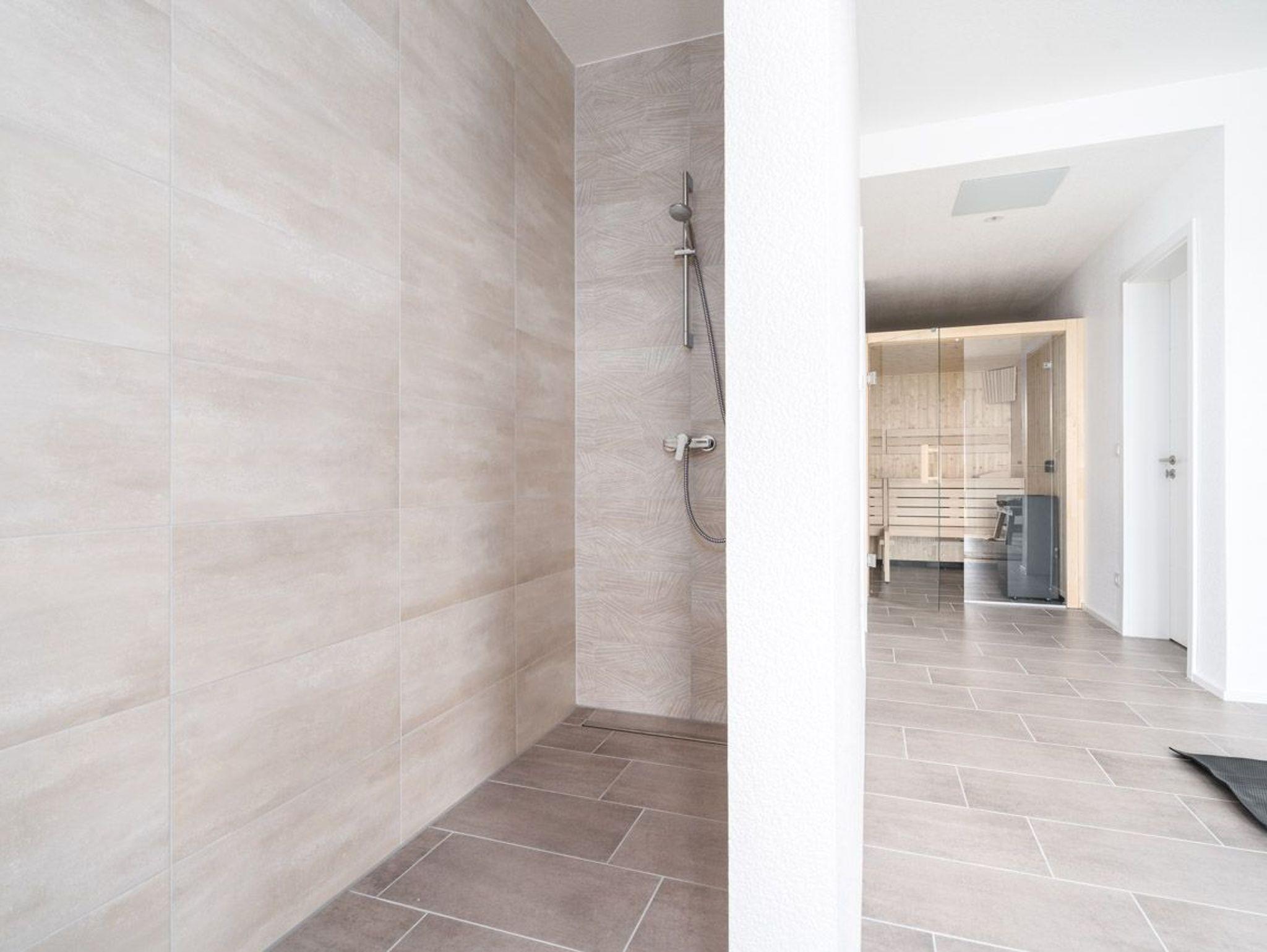 Ein besonderes Highlight der Villa ist der eigene kleine Fitnessraum, der mit einer Dusche, einem Gäste-WC und einer Sauna ausgestattet ist. Hier können Sie sich sportlich betätigen und anschließend direkt entspannen.