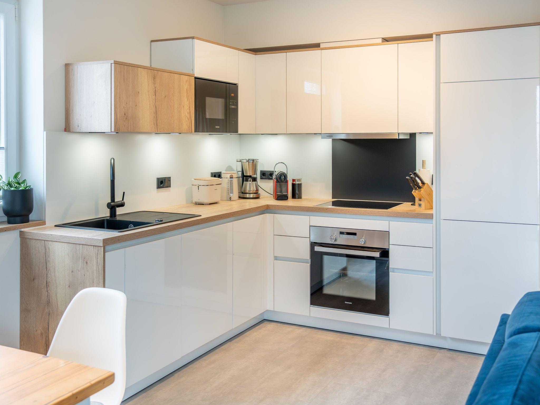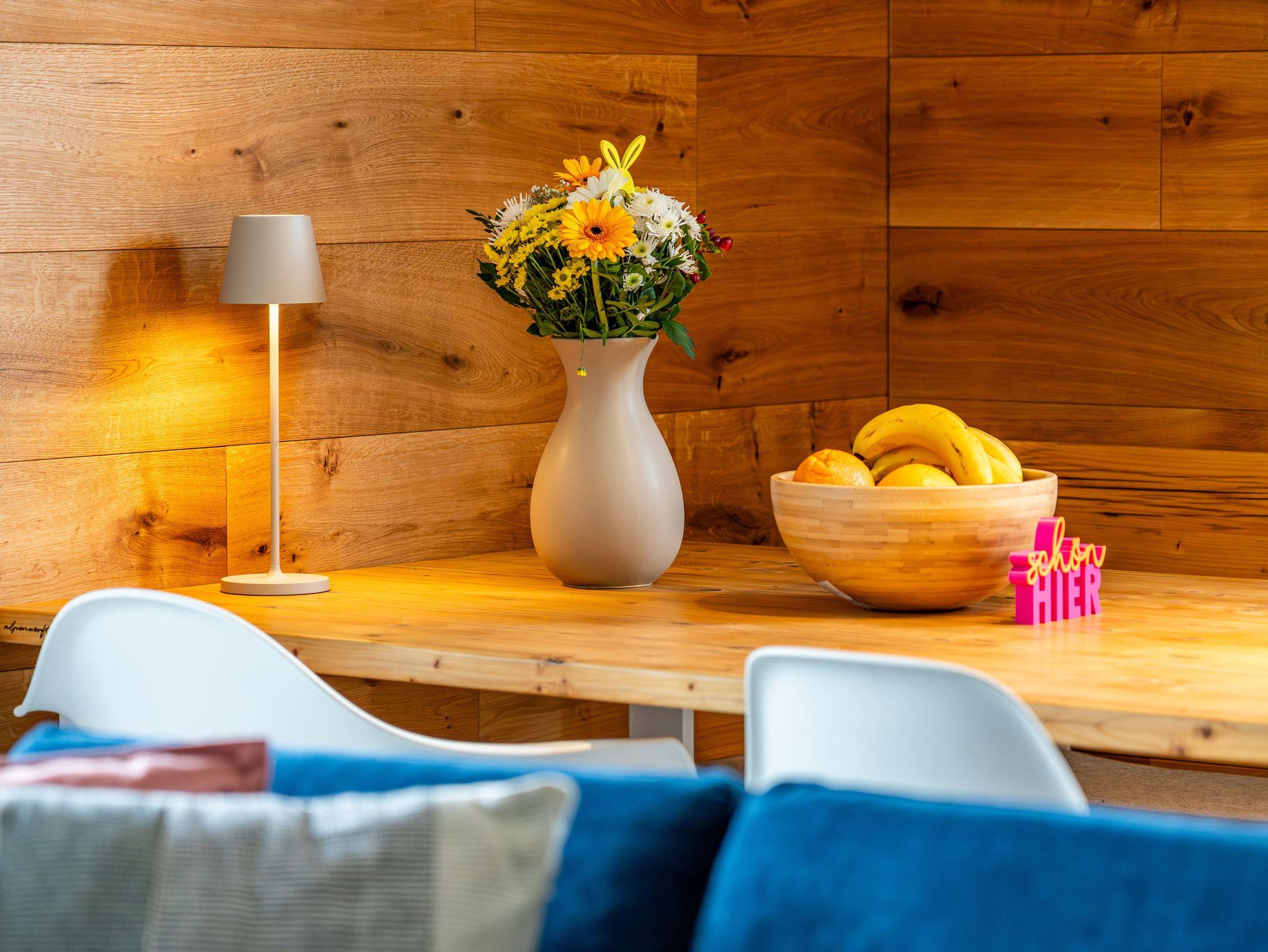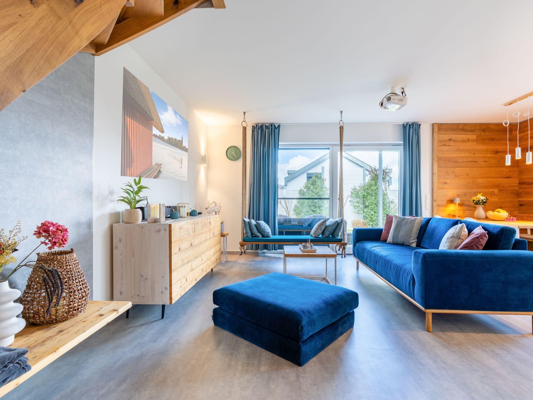 Genießen Sie ein Ambiente der Extraklasse mit hochwertigen Designmöbeln und einer geschmackvollen Einrichtung. Unser großzügiges Ferienhaus besticht durch seinen gemütlichen und gleichsam modern designten Charakter und bietet bis zu sechs Personen eine unvergessliche Urlaubsheimat. Das Leben spielt sich im großen Wohn-/Essbereich ab. Die loungeartige Sofaecke mit Indoor-Schaukel, dem Beamer mit Sky und dazwischen der moderne Glaskamin, wird sicherlich einer Ihrer Lieblingsplätze sein. Der große Esstisch und die offene, moderne und gut ausgestattete Küche bilden eine harmonische Einheit, die zum gemeinsamen Kochen und Genießen einladen. Im Erdgeschoss liegt ein helles, modernes und großzügiges Badezimmer mit Dusche und einer echten Wohlfühlsauna. Die beiden großen Schlafzimmer im Obergeschoss sind mit großen Hotelboxspringbetten aus der fränkischen Bettwarenfabrik ausgestattet, sodass Sie Schlafkomfort und Erholung auf höchstem Niveau erleben.