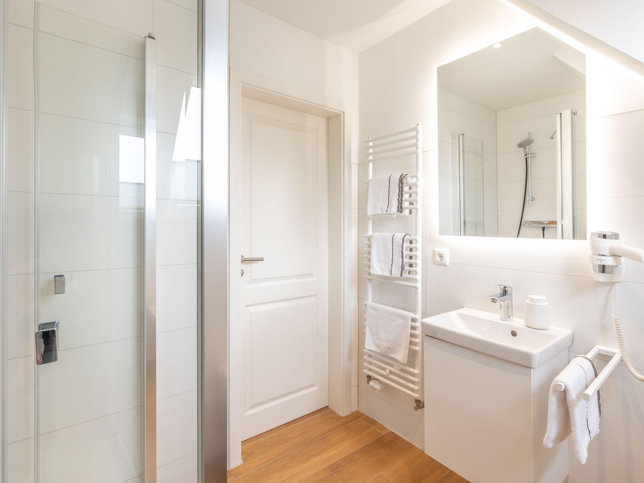 Eines der Schlafzimmer verfügt außerdem über einen Balkon mit Blick in Richtung Schlosspark und lädt zu atemberaubenden Sonnenuntergängen mit weitem Blick über die Natur ein. Ebenso befindet sich auf der Etage das zweite, sehr helle Bad mit Dusche sowie ein separater Raum mit Waschmaschine und Trockner.