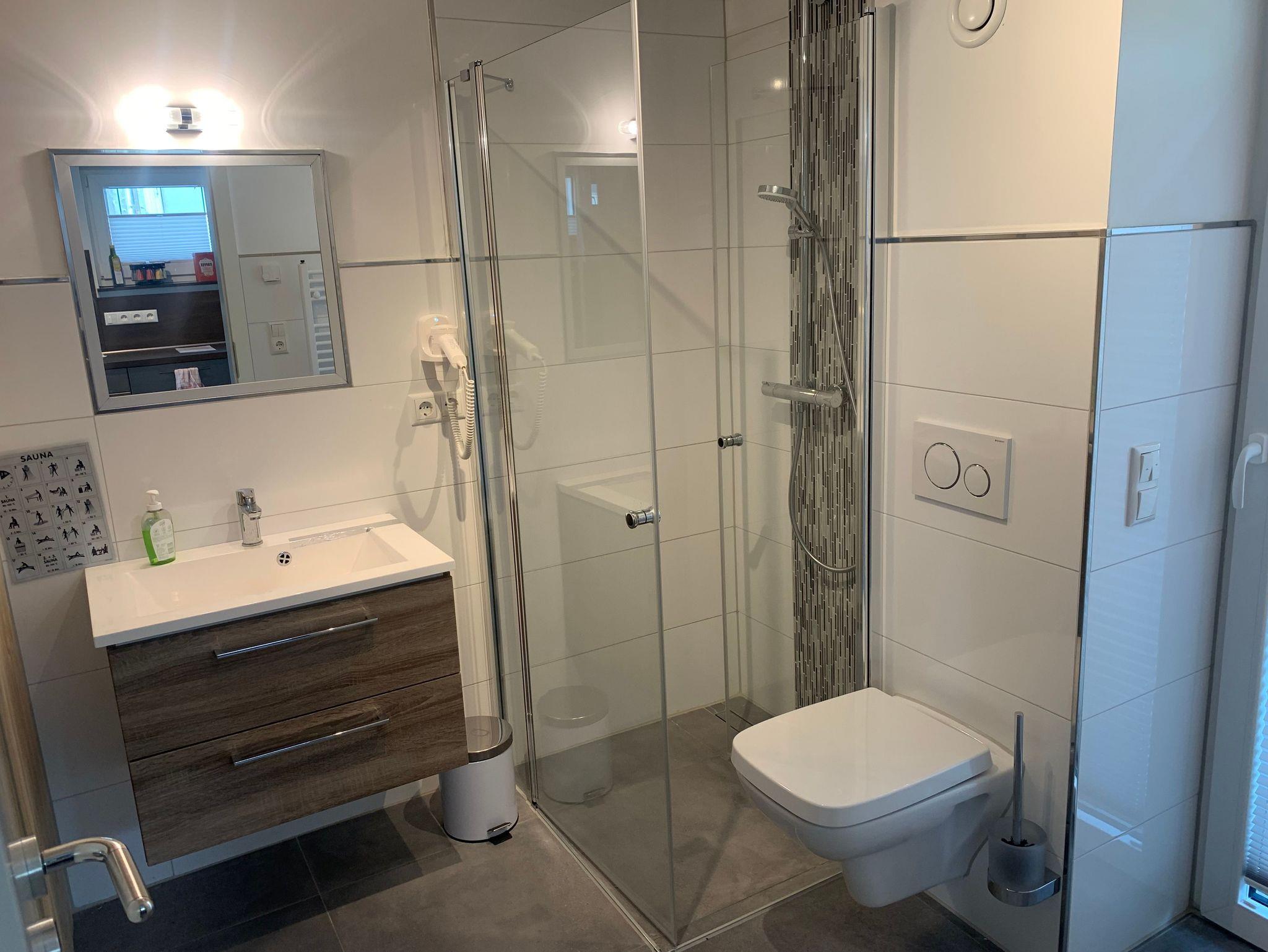 Die Bäder bieten moderne Waschtische und Raindanceduschen. Das große Bad verfügt zusätzlich über eine Sauna. Alle Räume werden über eine Fussbodenheizung beheizt..