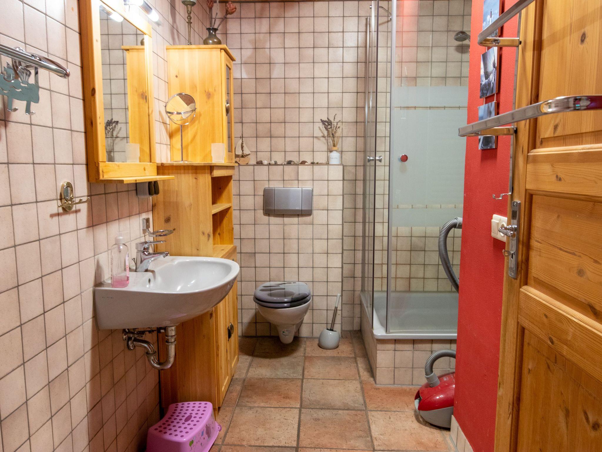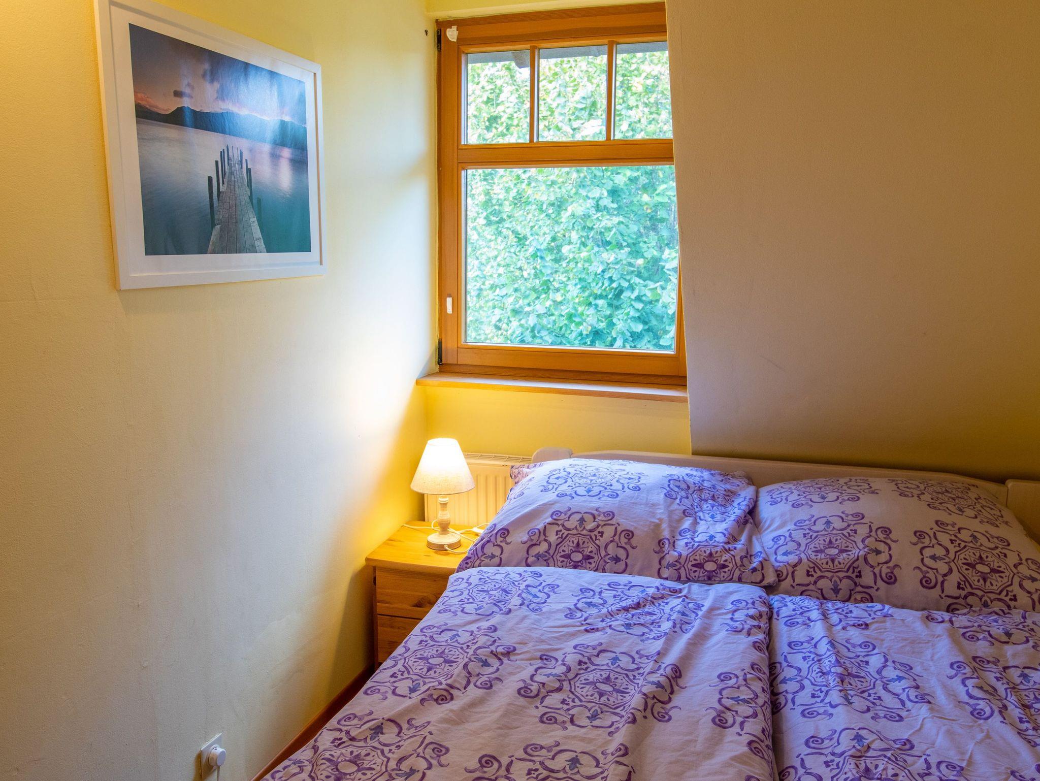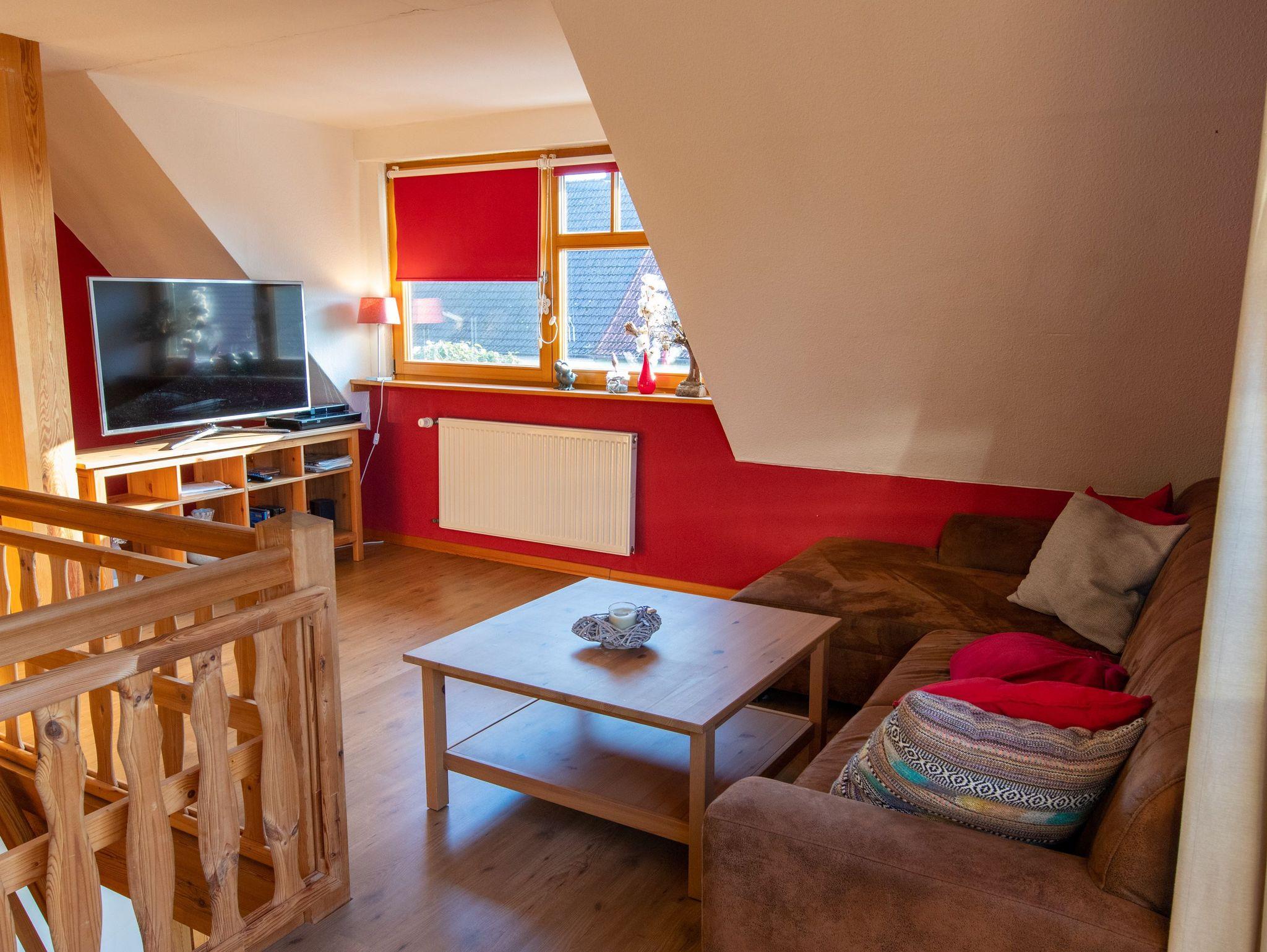 Über eine breite und kindersichere Treppe gelangt man in die zweite Etage. Auch hier ist alles großzügig und hell. Es gibt eine Fernsehecke mit großem Flachbildfernseher und einer ausziehbaren Couch (140x200). Eine Kuschel-und Leseecke mit Kamin befindet sich an der anderen Seite von diesem Raum. Die beiden Schlafzimmer im Obergeschoss verfügen über ein Doppelbett (140x200) bzw. über ein Doppelbett (140x200) und einem Einzel- (90x200) mit zusätzlichem Ausziehbett. 2 Kinderreisebetten mit Extra-Matratze sind vorhanden. Das Bad in dieser Etage hat eine große Wanne, WC und einen Glaswaschtisch.