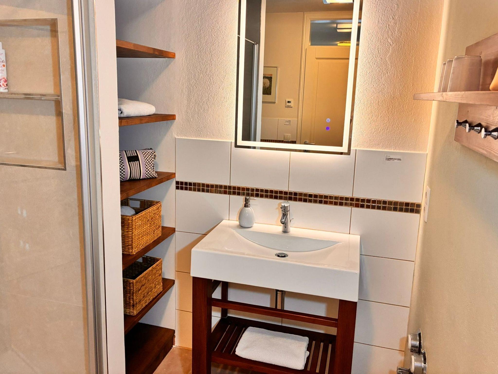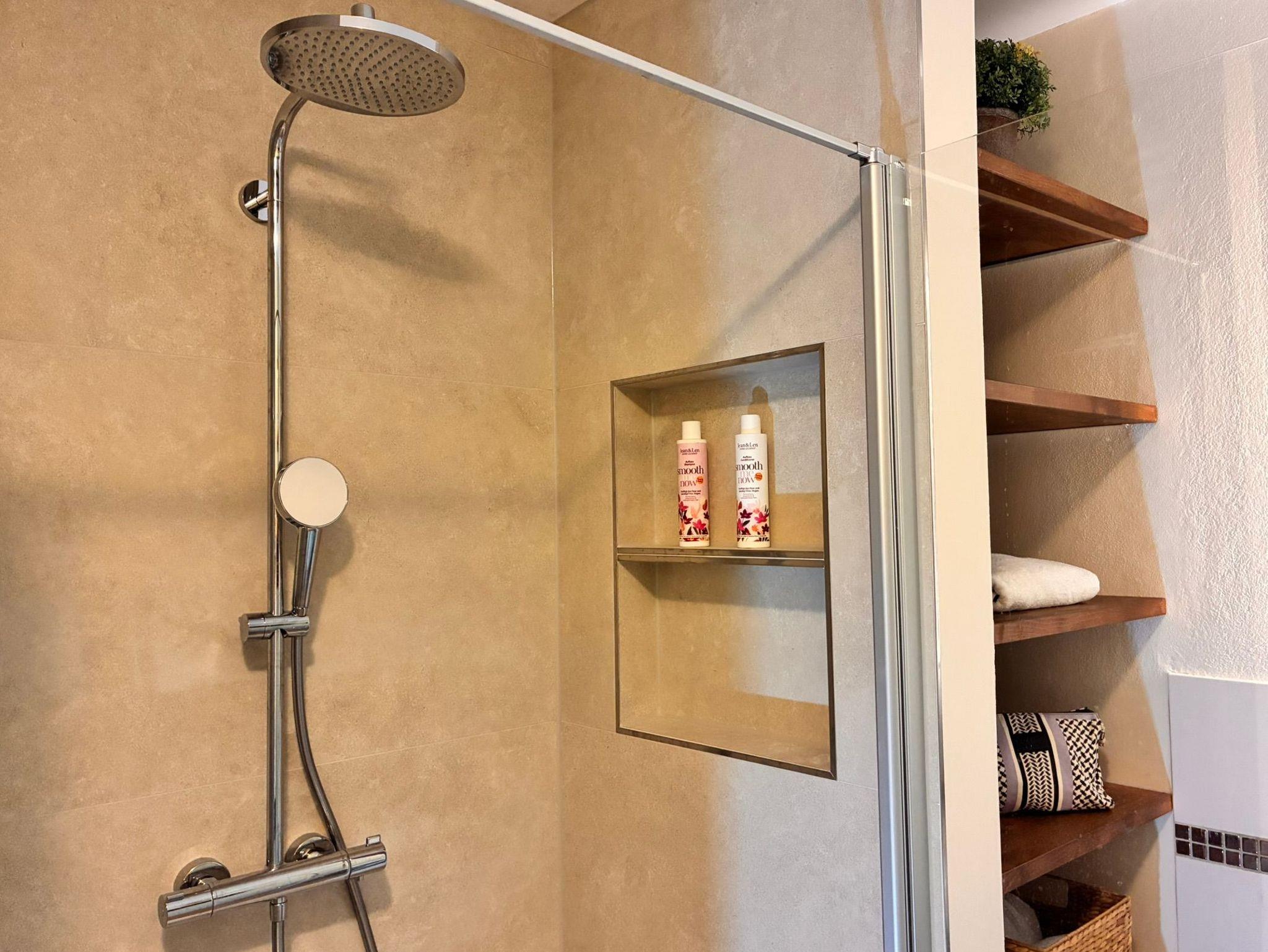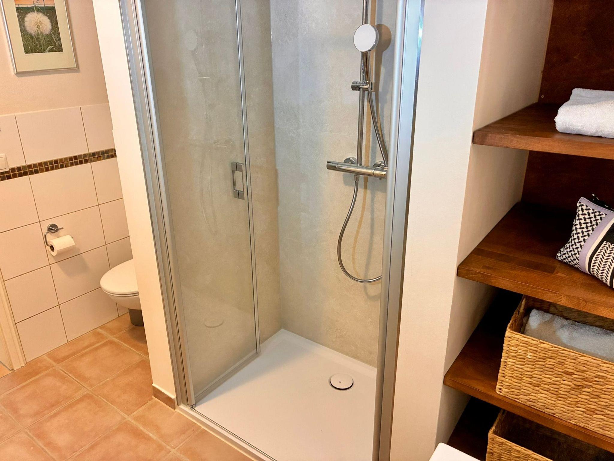 Anfang 2026 wurde das Bad renoviert und nun sorgt eine Dusche mit 110 cm Breite und extra flachem Einstieg, sowie Rainshower Duschsystem für ein entspantes Wellness Erlebnis. Der LED Badezimmerspiegel und die zusätzlichen Ablagemöglichkeiten bieten ein komfortables Ambiente während Ihres Aufenthalts.
