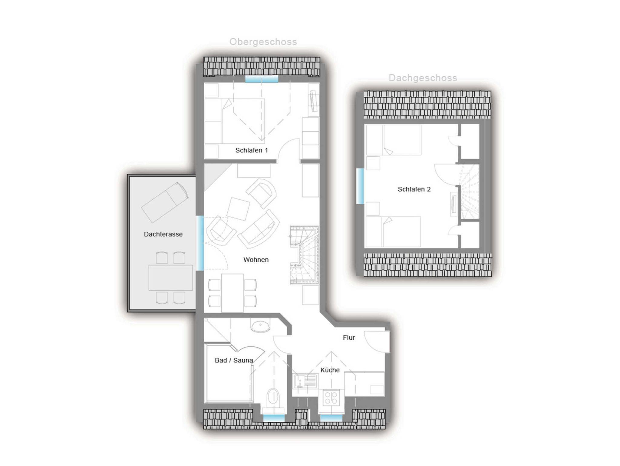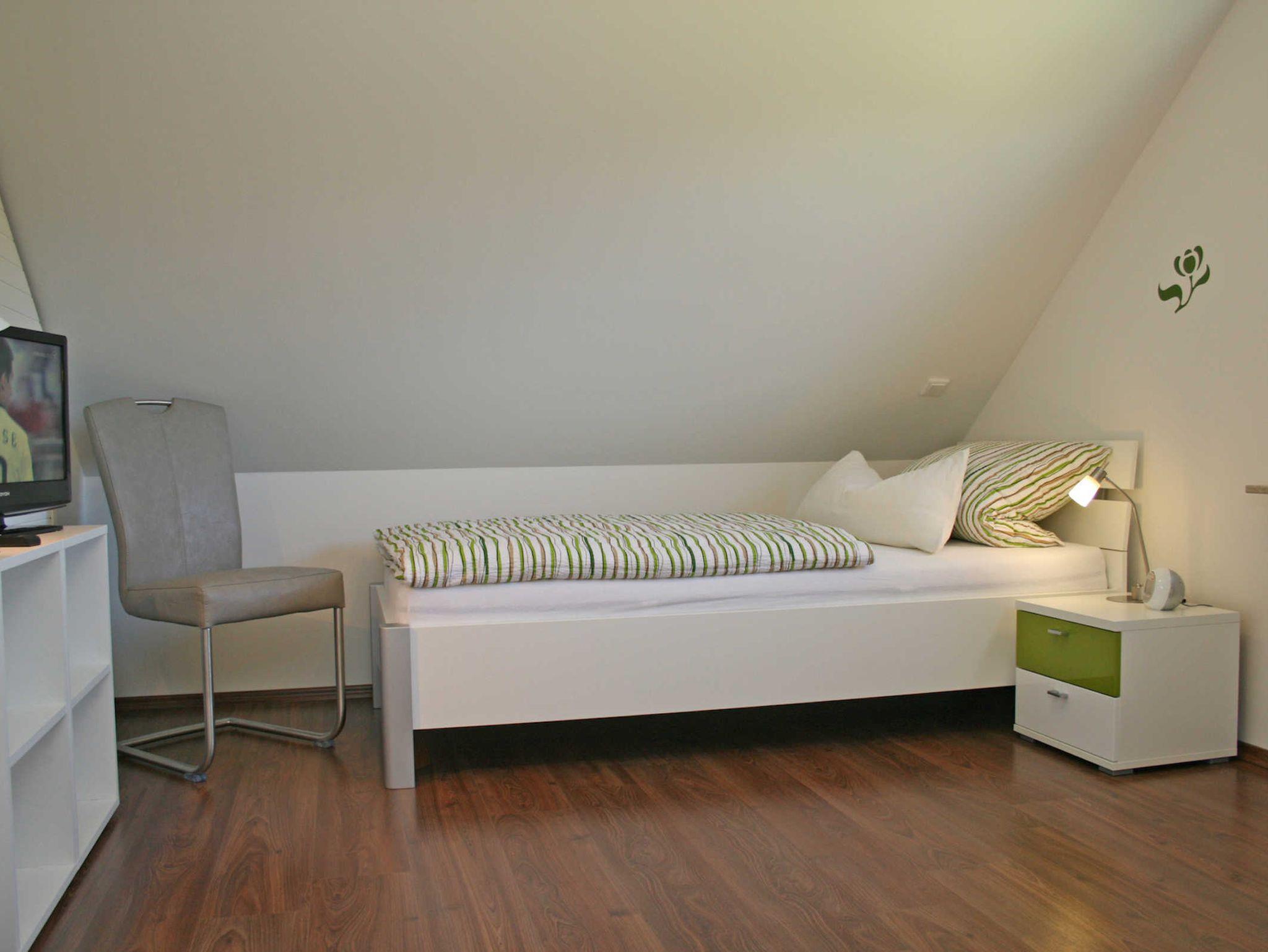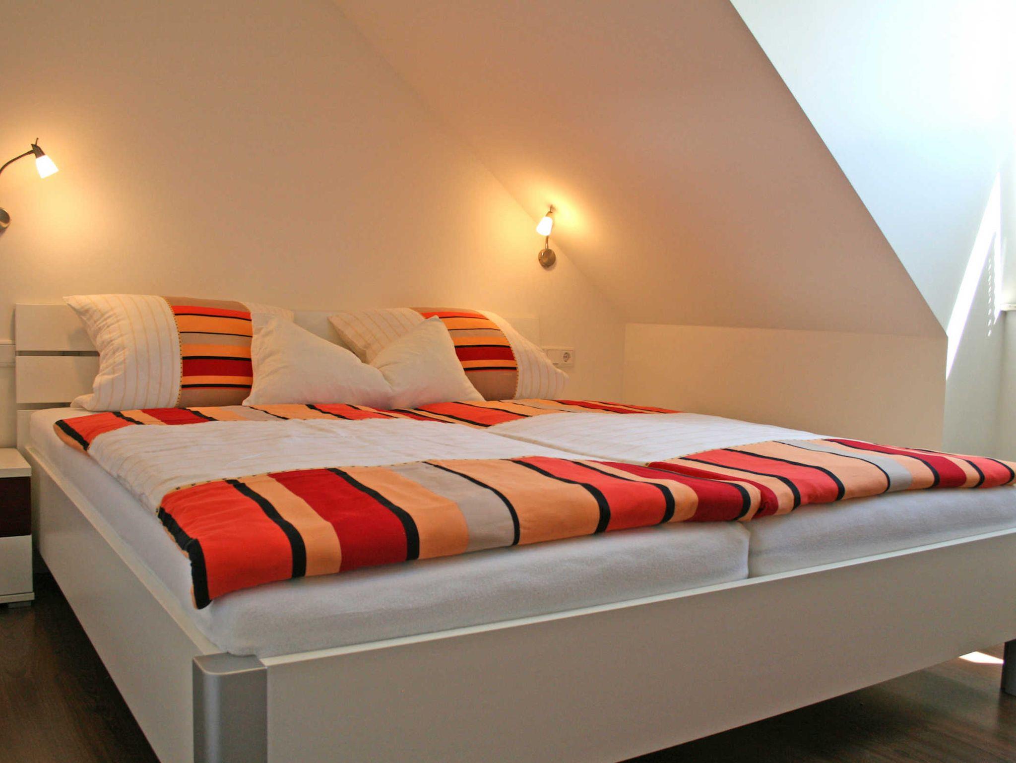 Das Schlafzimmer im Obergeschoss ist mit einem Doppelbett und einem Flatscreen-TV ausgestattet. Das zweite Schlafzimmer befindet sich im Dachgeschoss und ist mit zwei Einzelbetten und einem Flatscreen-TV ausgestattet.