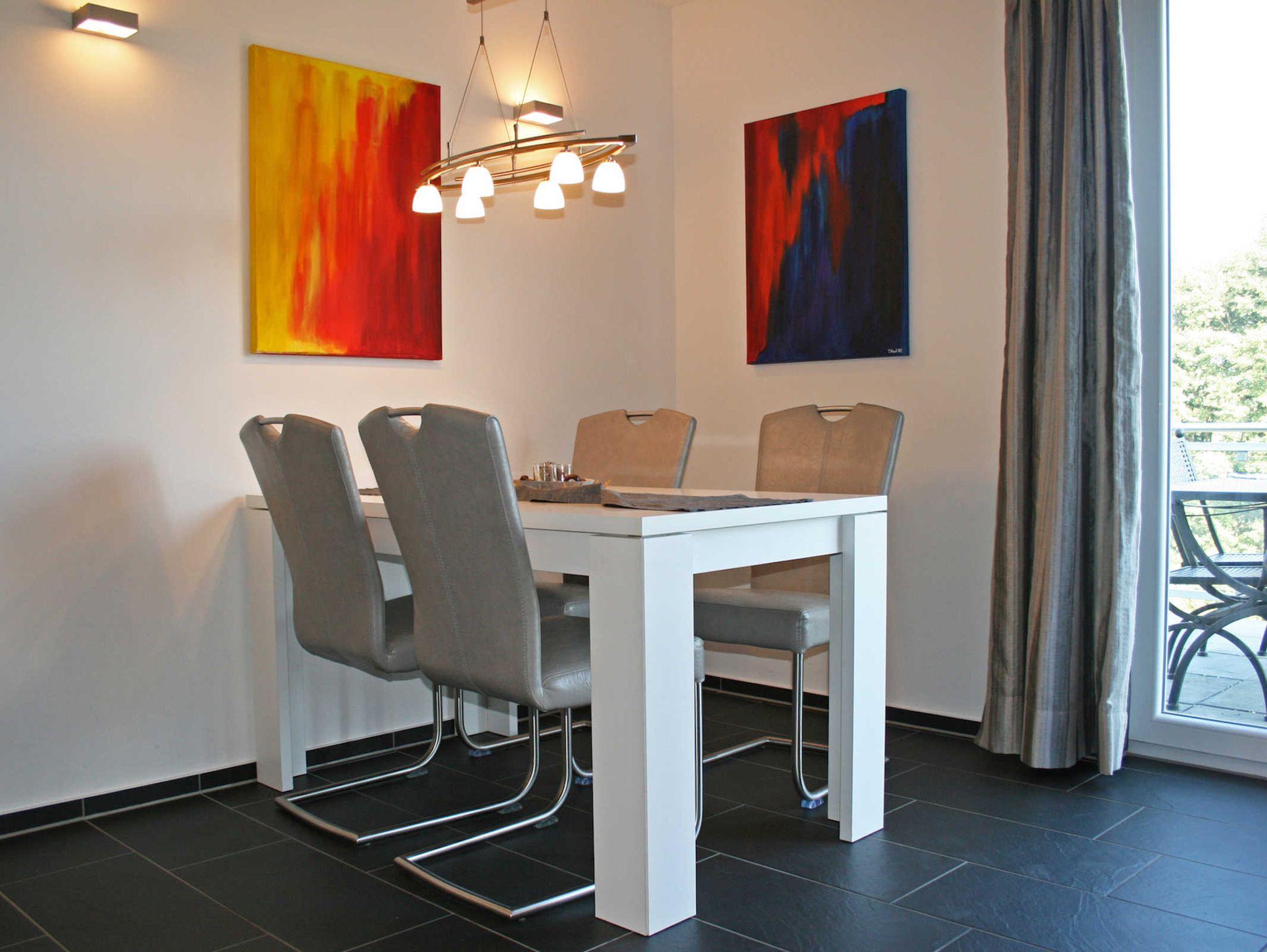 Eine komplett ausgestattete Küche mit Spülmaschine, Kühl- und Gefrierschrank, Umluftherd mit Seranfeld und Mikrowelle sowie der Essbereich laden zum Kochen und Verweilen ein.