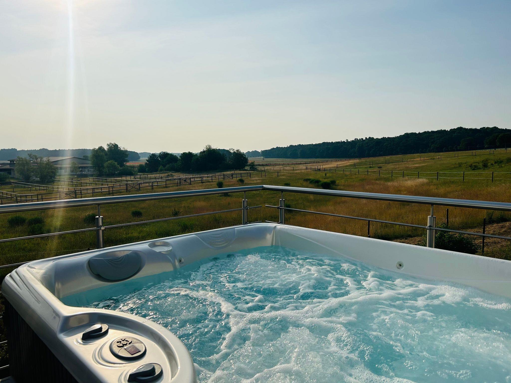 Ein absolutes Highlight ist der Außen Whirlpool auf dem Balkon. Hier können Sie sich bei einem traumhaften Ausblick auf die Felder entspannen und den Alltagsstress vergessen oder Sie genießen entspannende Stunden auf dem Balkon im wohnungseigenen Außen Whirlpool.