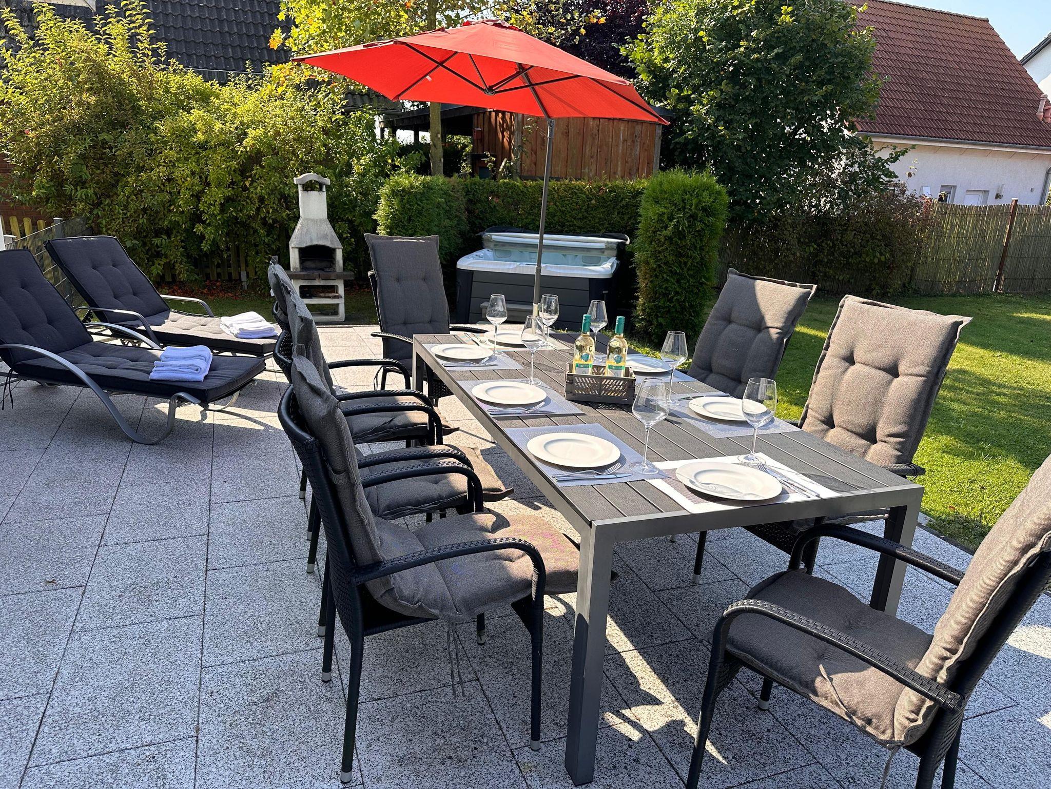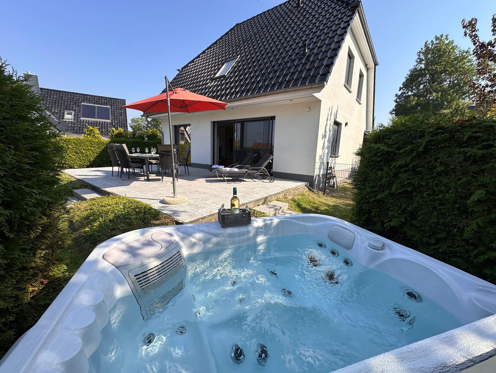 Unsere Luxus-Villa möchte mit 3 Schlafzimmern, 2 Bädern, Sauna & ganzjährigem 38 Grad Außenwhirlpool, und eingezäunten Garten bei Ihnen punkten.
