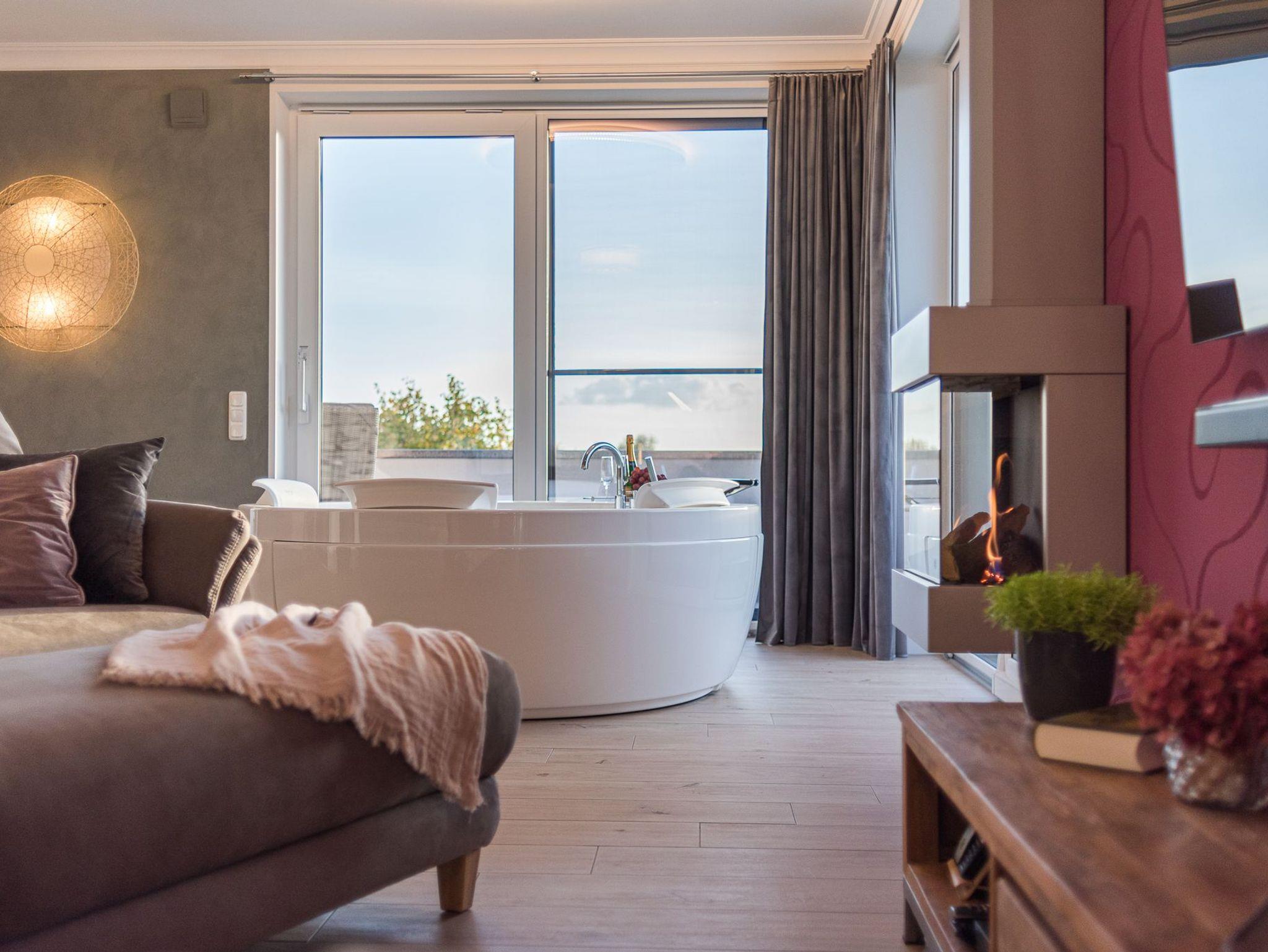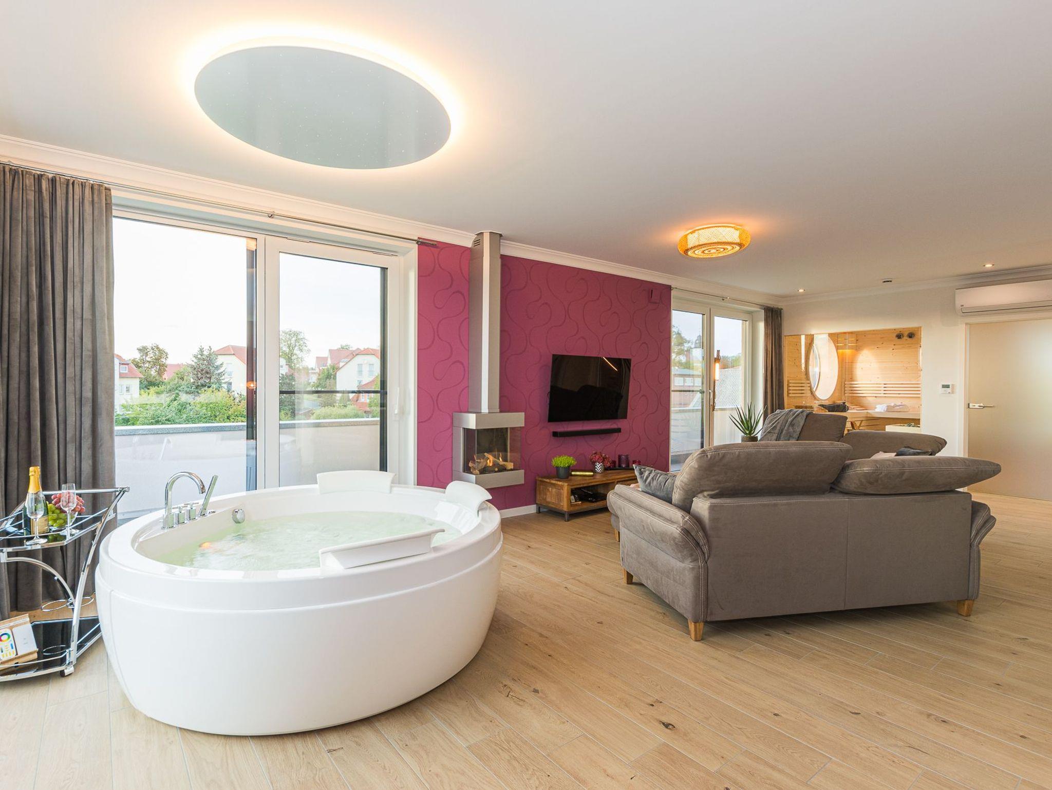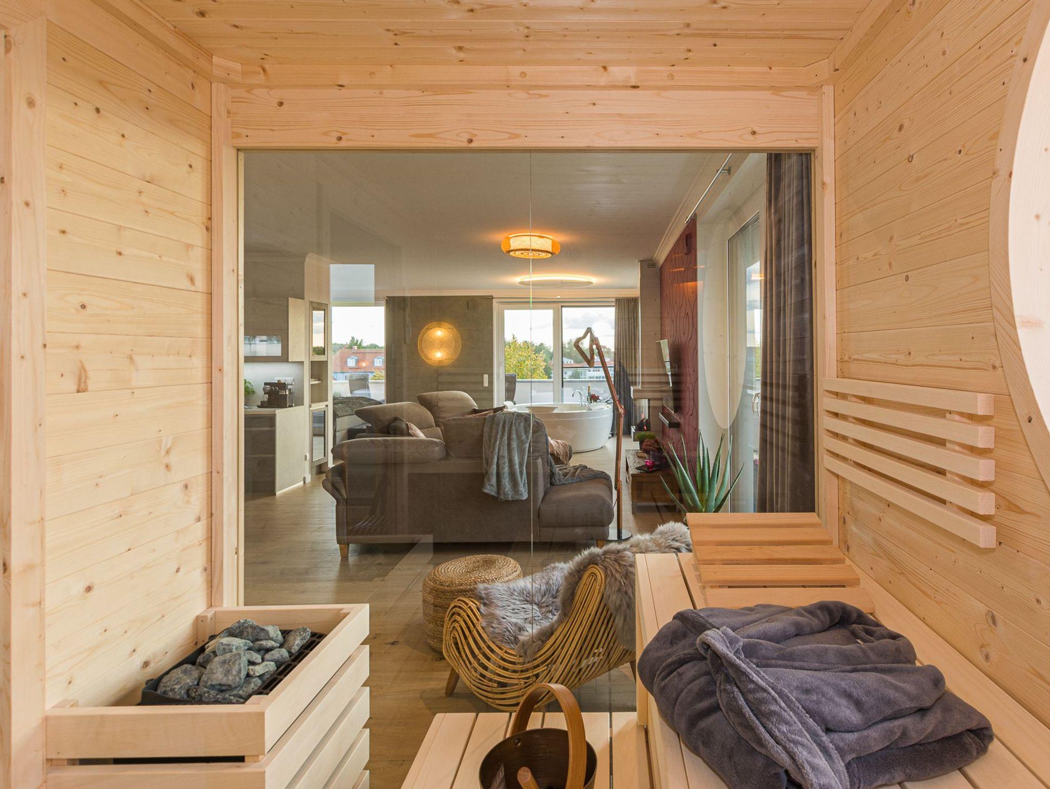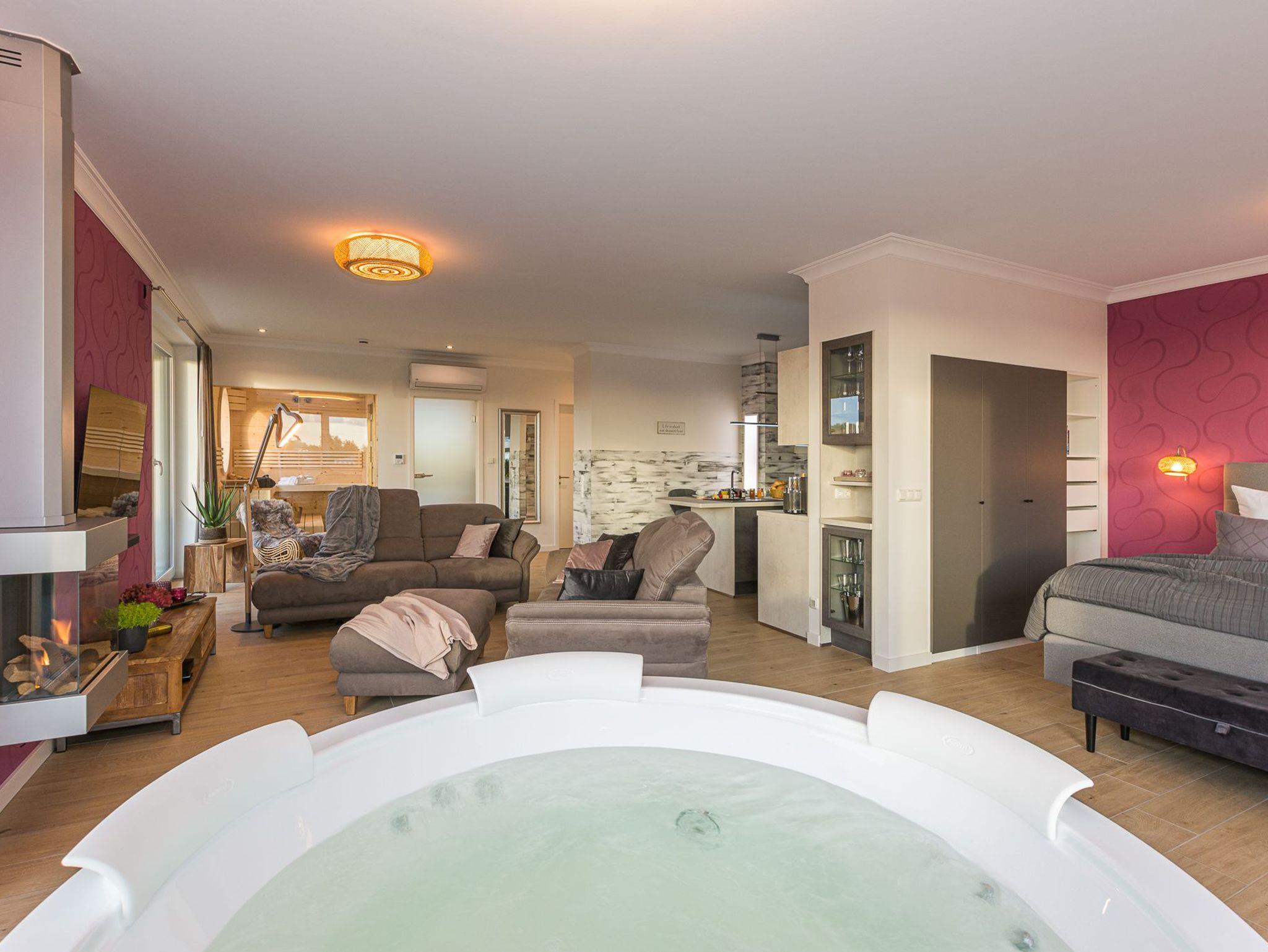 Erleben Sie Luxus und ein sicheres Gefühl in der eigenen Sauna, behagliche Wärme am modernen Gaskamin oder ein Entspannungsbad in der im Wohnraum integrierten Whirlpool-Badewanne, die Platz für 2 Personen bietet. Ob einfach nur Musik hören, einen Film genießen oder direkt aus der Badewanne in die Natur und auf den Sonnenuntergang schauen.