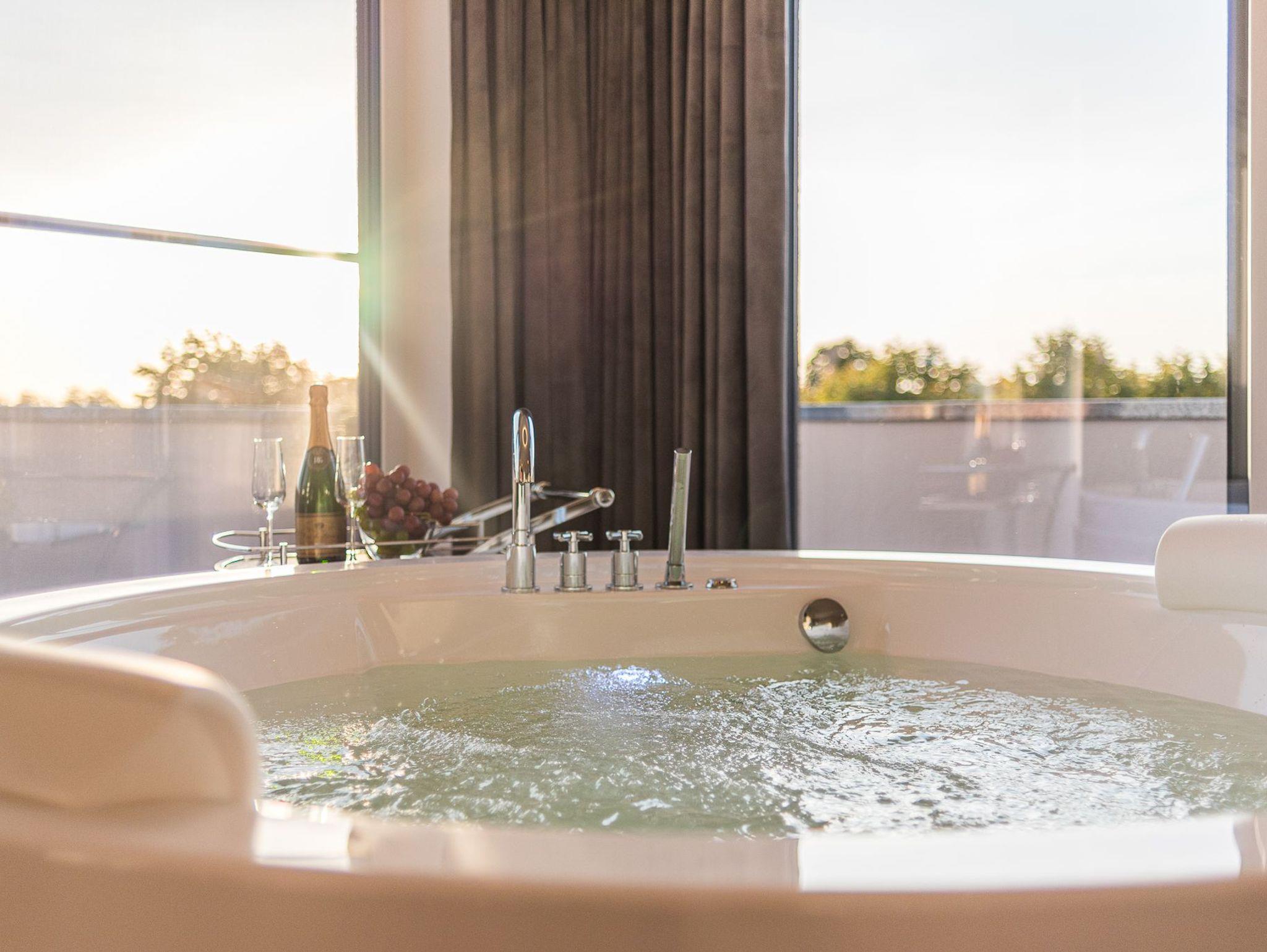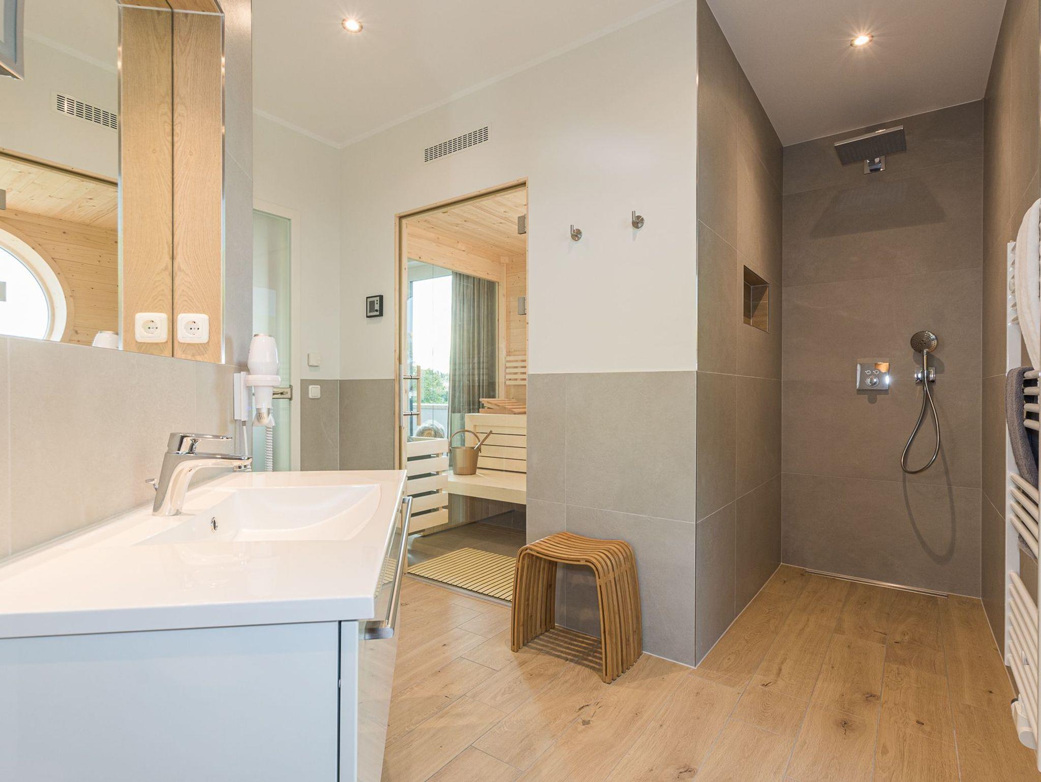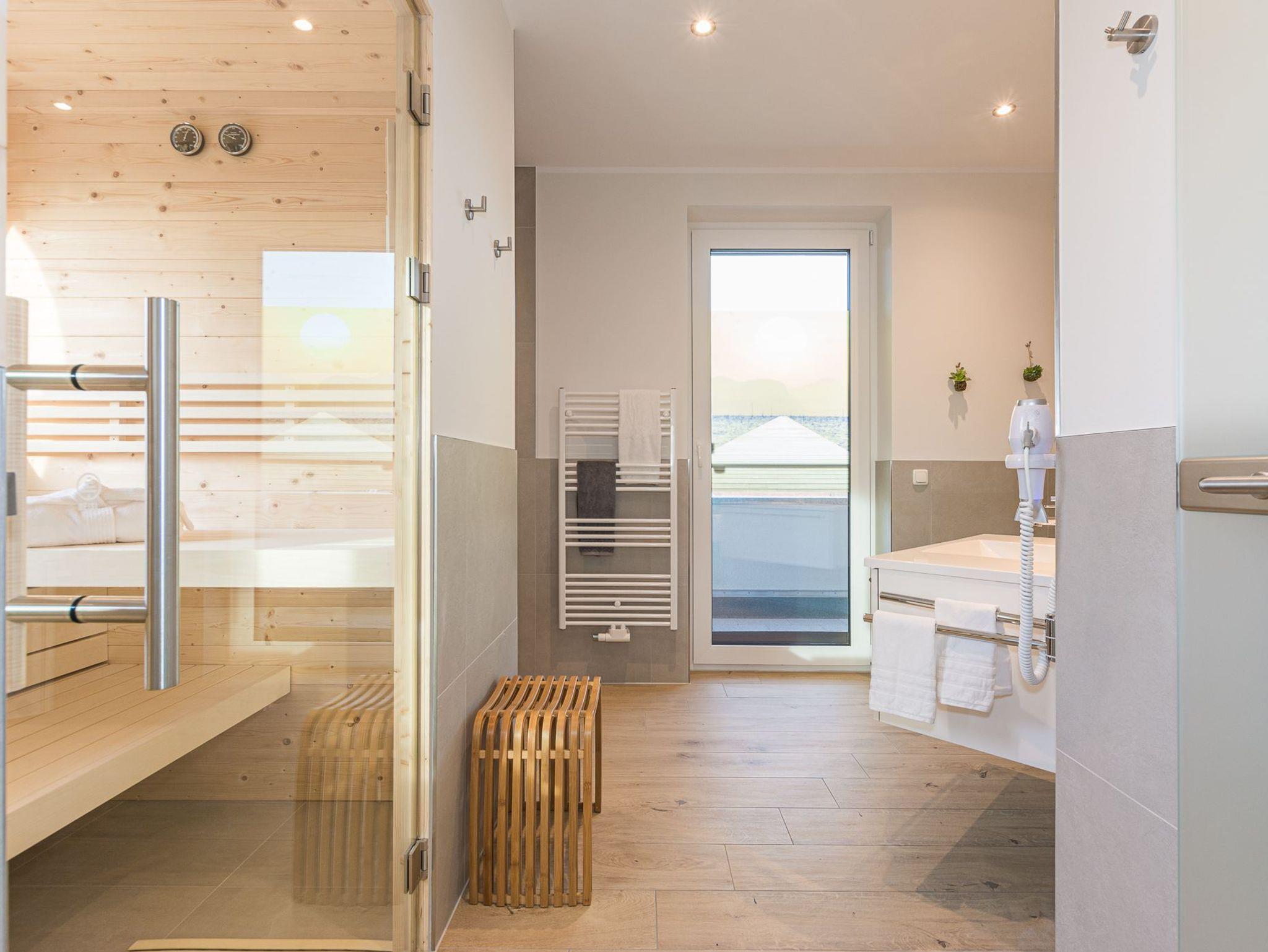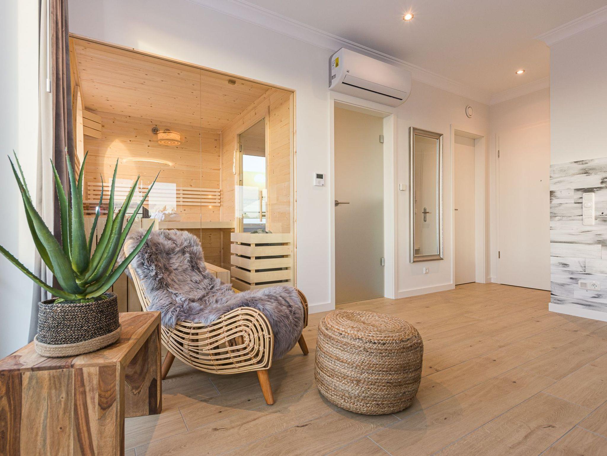 Erleben Sie Luxus und ein sicheres Gefühl in der eigenen Sauna, behagliche Wärme am modernen Gaskamin oder ein Entspannungsbad in der im Wohnraum integrierten Whirlpool-Badewanne, die Platz für 2 Personen bietet. Ob einfach nur Musik hören, einen Film genießen oder direkt aus der Badewanne in die Natur und auf den Sonnenuntergang schauen.