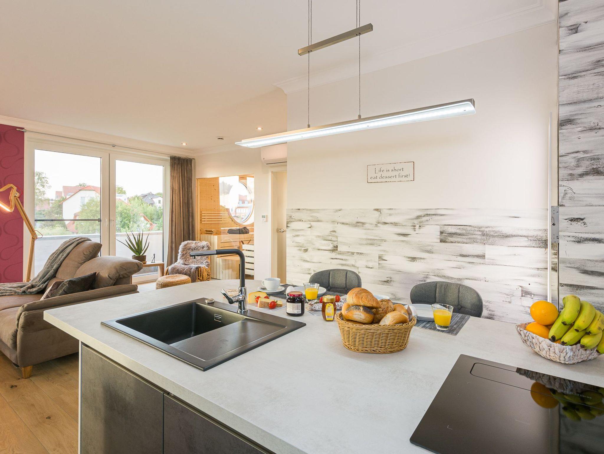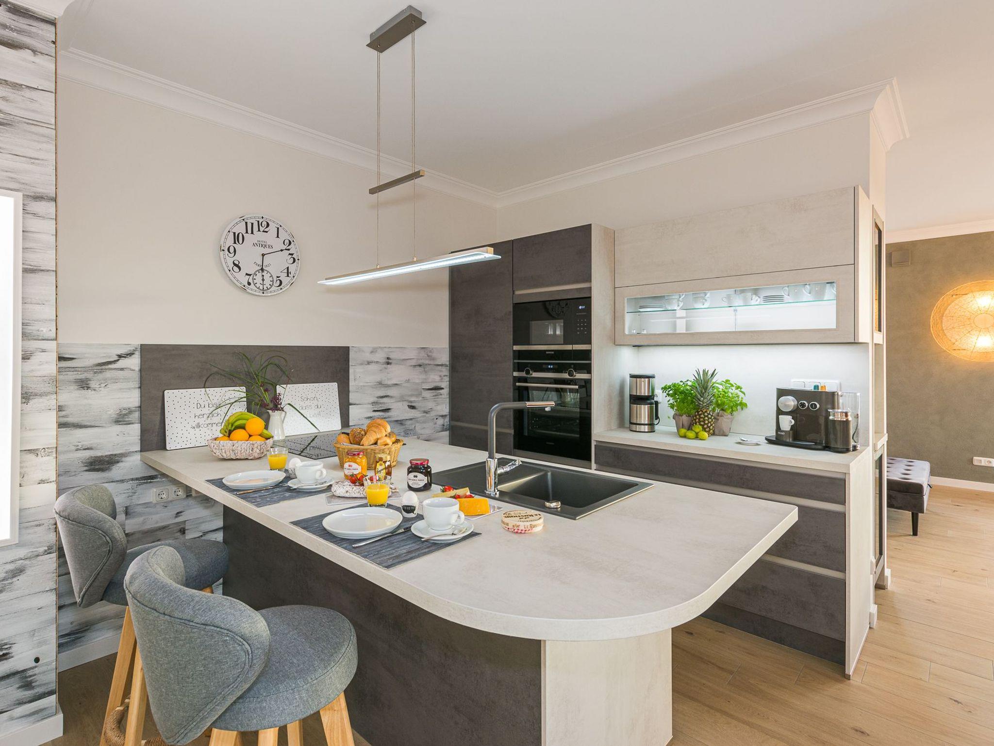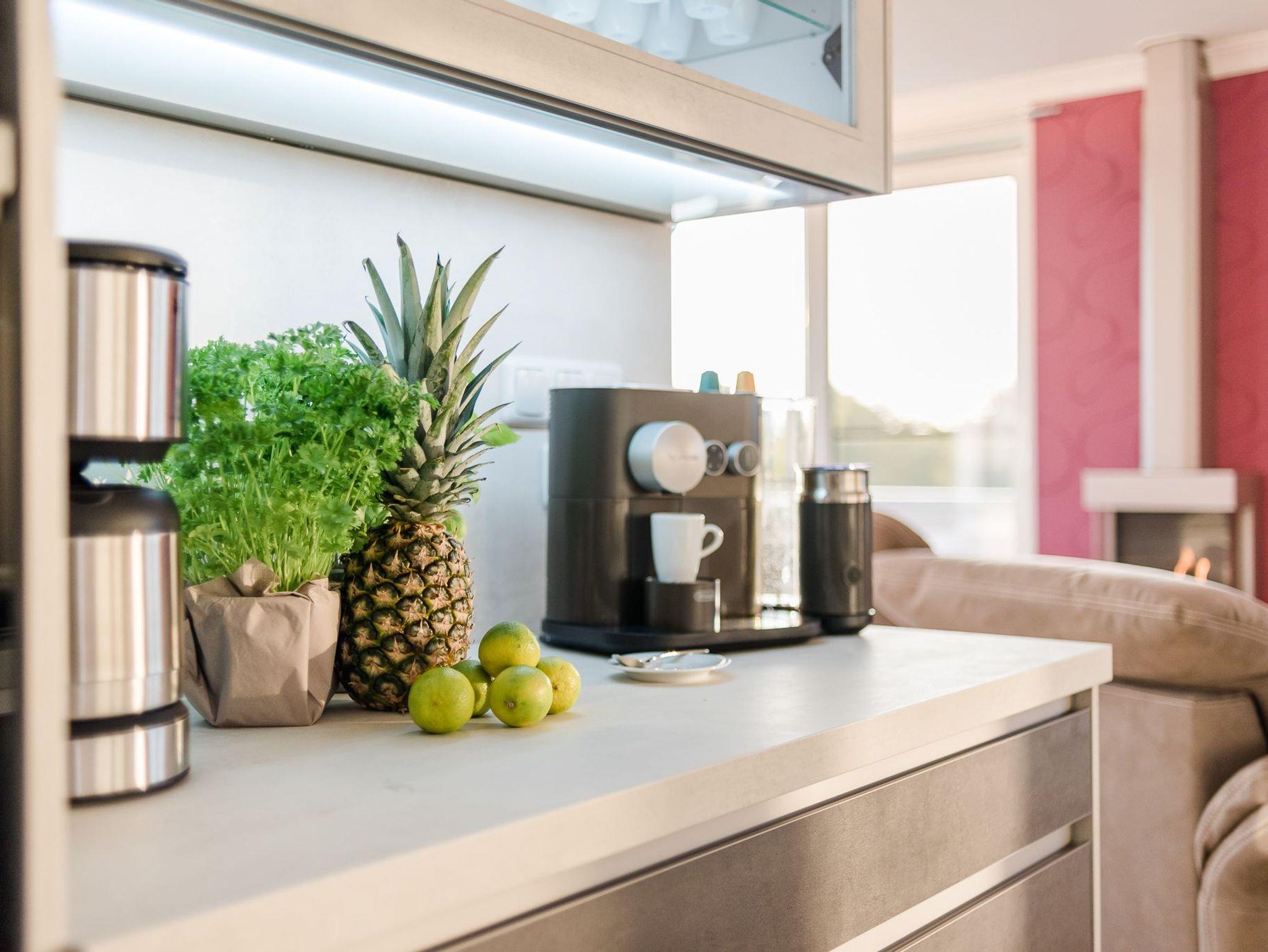 Und wenn Sie keine Lust haben essen zu gehen, bereiten Sie sich in der komplett eingerichteten Küchenzeile Ihr eigenes Dinner zu. Alles was es dazu braucht ist vorhanden. Moderne Küchengeräte, ob Mikrowelle, Multifunktionsbackofen oder Induktionskochfeld, ob geräumiger Kühlschrank oder großes Gefrierfach, machen das Schlemmen leicht. Und im Anschluss sorgt der Geschirrspüler schnell wieder für sauberes Geschirr. Zusätzlich steht eine Nespresso-Maschine mit Milchaufschäumer (6er Kapsel-Grundausstattung inklusive) oder wer es lieber klassisch mag eine Filterkaffee-Maschine zur Verfügung.
