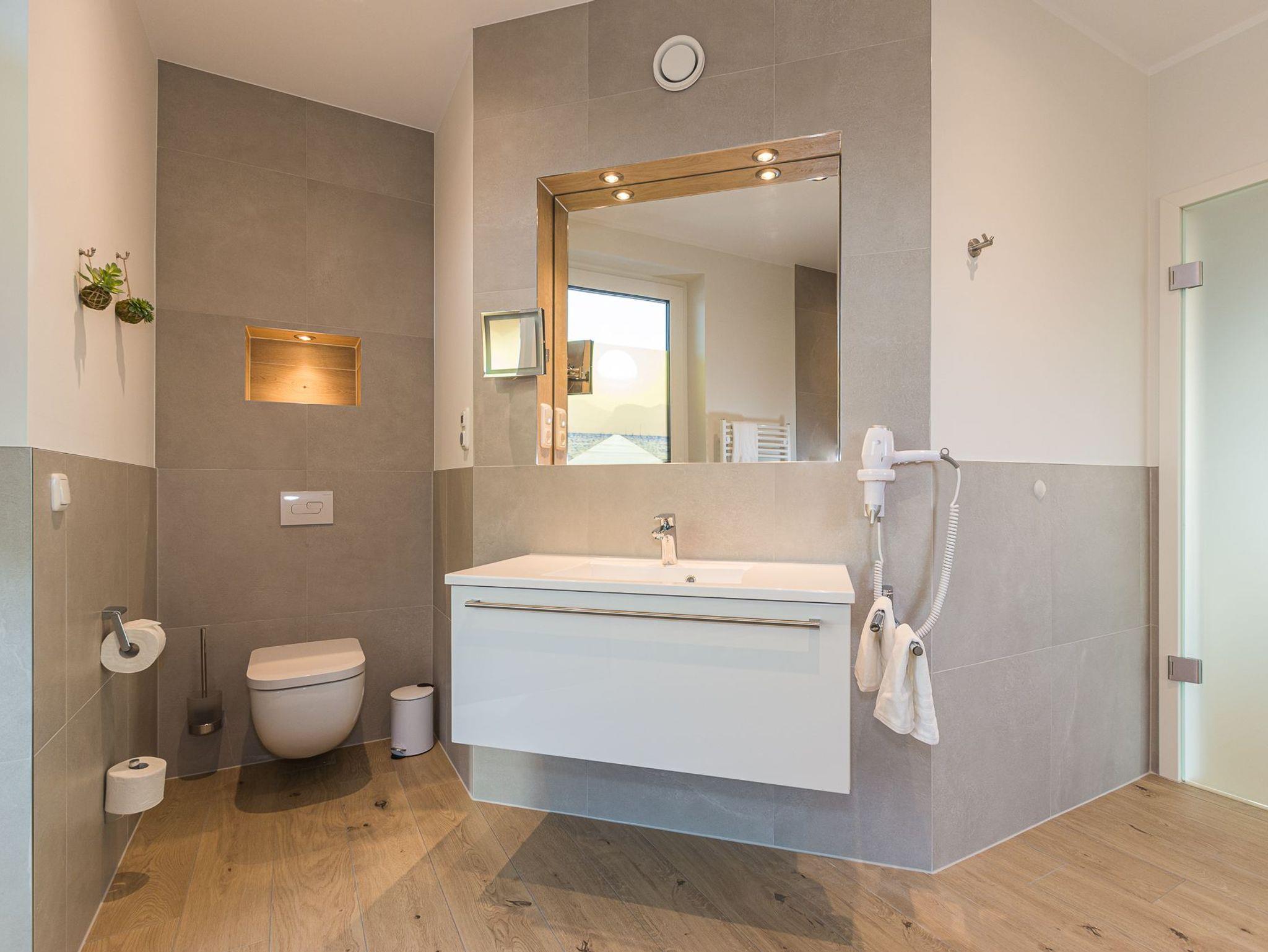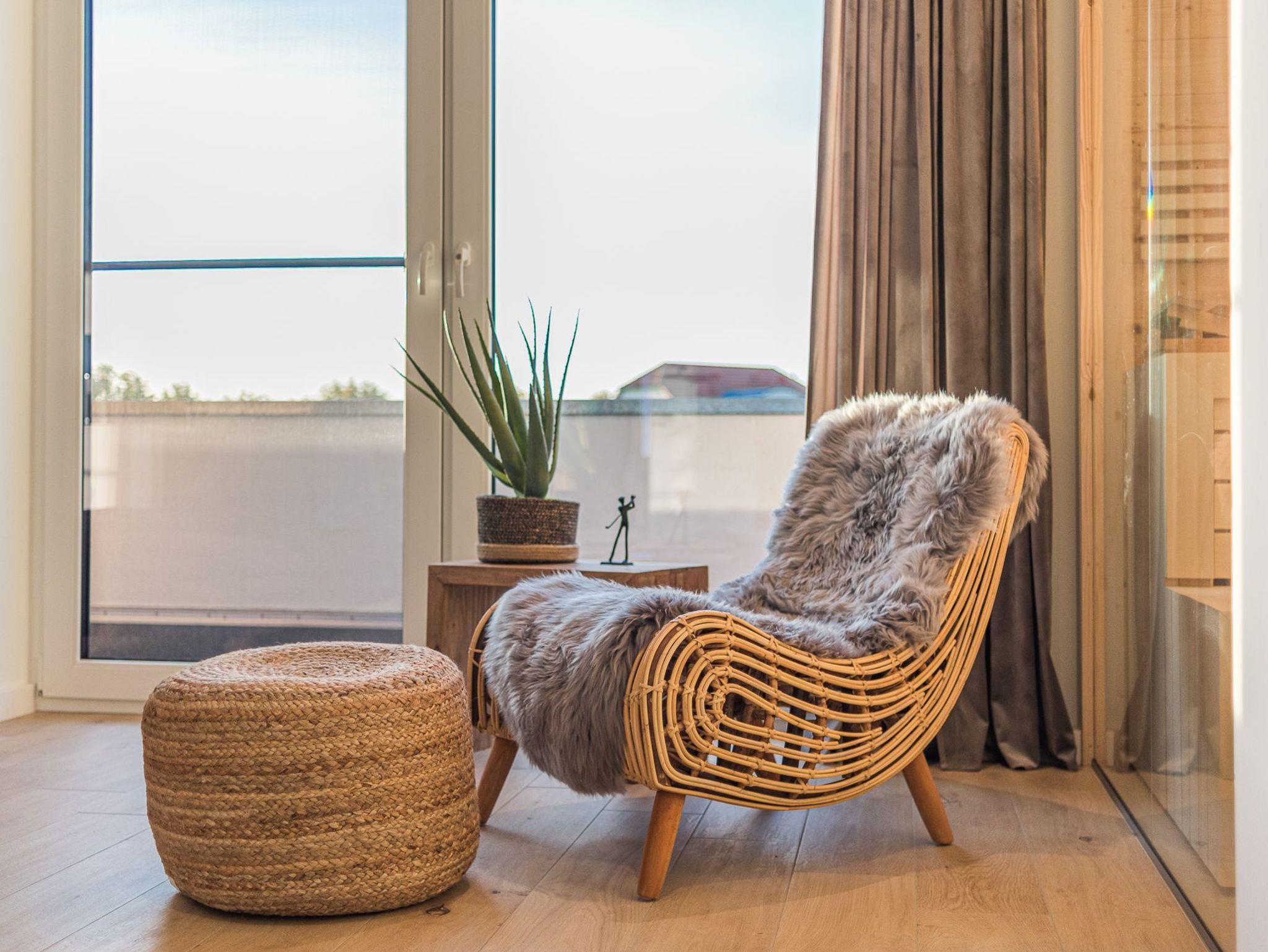 Die Böden der Ferienwohnungen sind mit hochwertigem Feinsteinzeug (Fliesen) im Holz-Design belegt und eine Fußbodenheizung (pro Raum steuerbar) sorgt für behagliche Wärme. Im separaten Abstellraum steht Ihnen zur kostenfreien Nutzung eine Waschmaschinen-Trockner-Kombi, nebst Bügeleisen und Bügelbrett zur Verfügung. Ein Insektenschutz an allen Türen und Fenstern ist ebenfalls vorhanden, wie auch ein kostenfreier WLAN-Zugang. Die bodentiefen Fenster und Terrassentüren und das Fenster in der Sauna sorgen für Licht durchflutete Räumlichkeiten, die durch Vorhänge für Privatsphäre oder Sonnenschutz sorgen. Das Dach ist mit einem zusätzlichen Hitzeschutz ausgestattet, wodurch auch an heißen Tagen zusammen mit der optional nutzbaren Klimaanlage für eine angenehme Temperatur in den Räumen für einen erholsamen Schlaf sorgen.