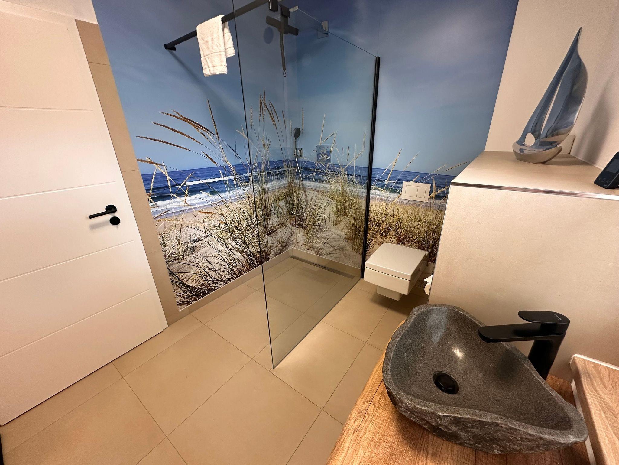 Die Bäder bieten moderne Waschtische und Raindanceduschen. Alle Räume werden über eine Fussbodenheizung beheizt..