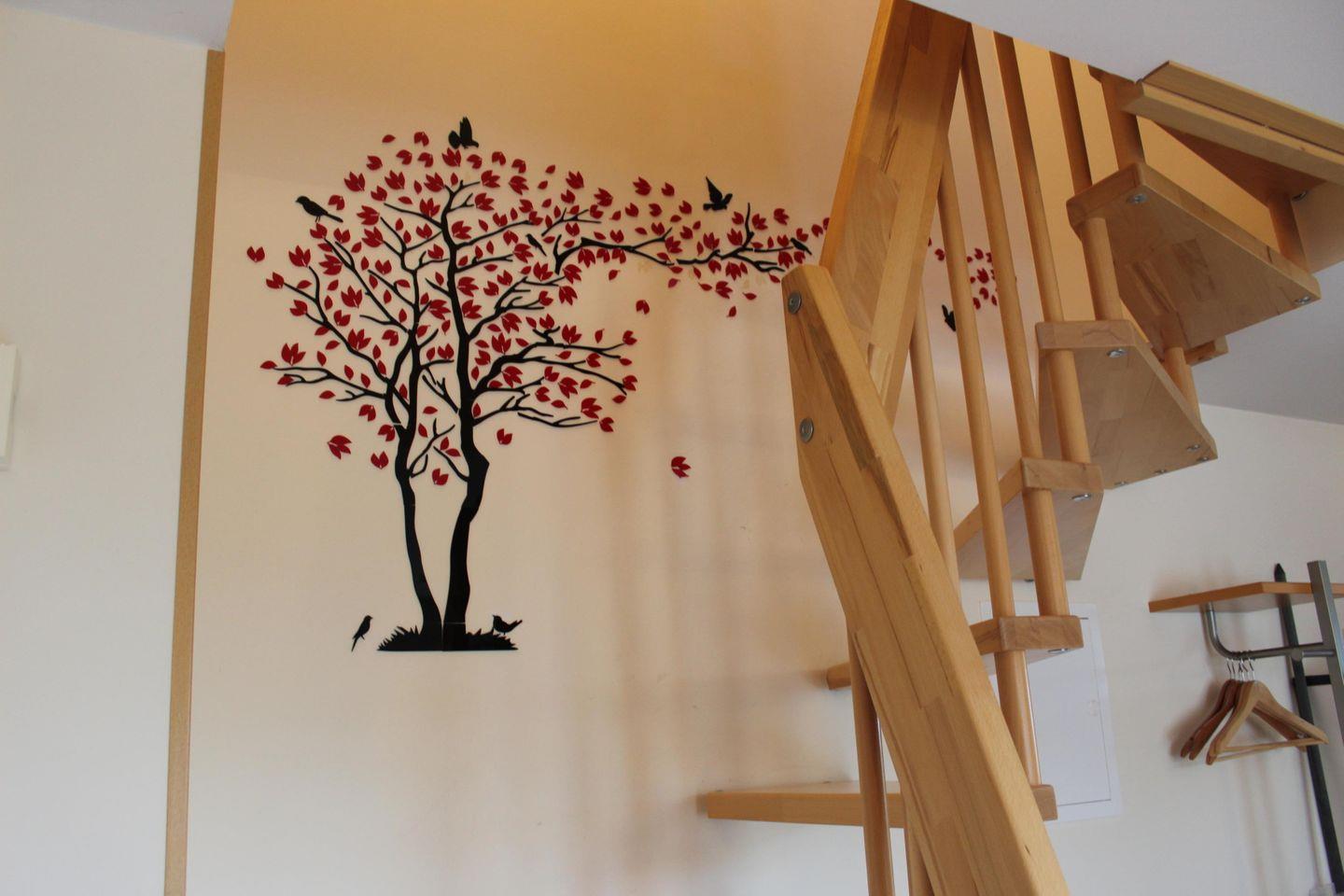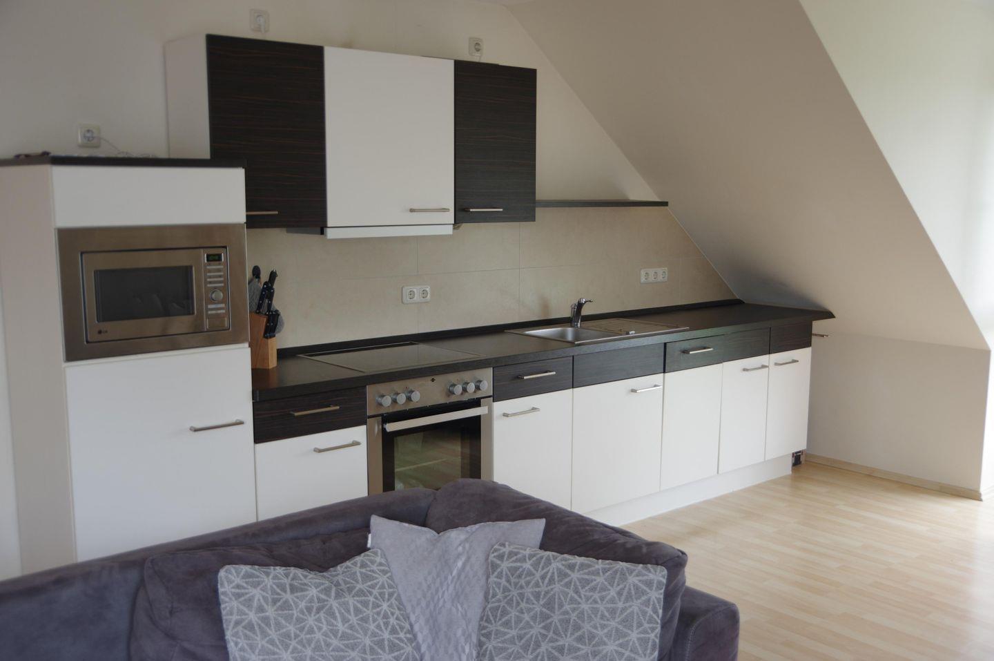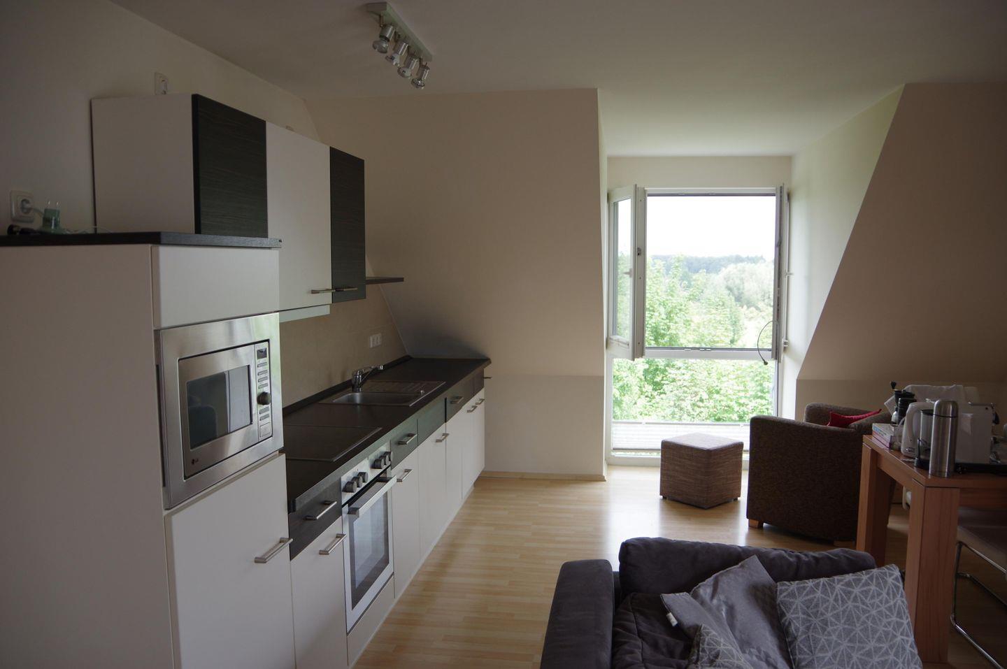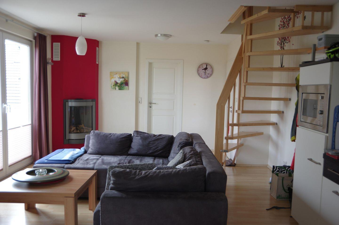 Die Wohnung befindet sich im 1. Stock eines gepflegten Mehrfamilienhauses und besticht durch Ihren großzügigen, offen gestalteten Wohnbereich mit einer voll ausgestatteten Küche und gemütlichen Essplatz. Ein moderner Gaskamin sorgt hier auch an kühleren Abenden für eine behagliche Atmosphäre. Ein besonderes Highlight ist der große Balkon mit herrlichem Blick ins Grüne - perfekt für ein Frühstück in der Morgensonne oder einen entspannten Abend mit einem Glas Wein. Das Badezimmer bietet mit einer eigenen Sauna zusätzlichen Komfort und Erholung. Im Dachgeschoss befindet sich das gemütliche Schlafzimmer mit einem Doppelbett - ideal für erholsame Nächte.
