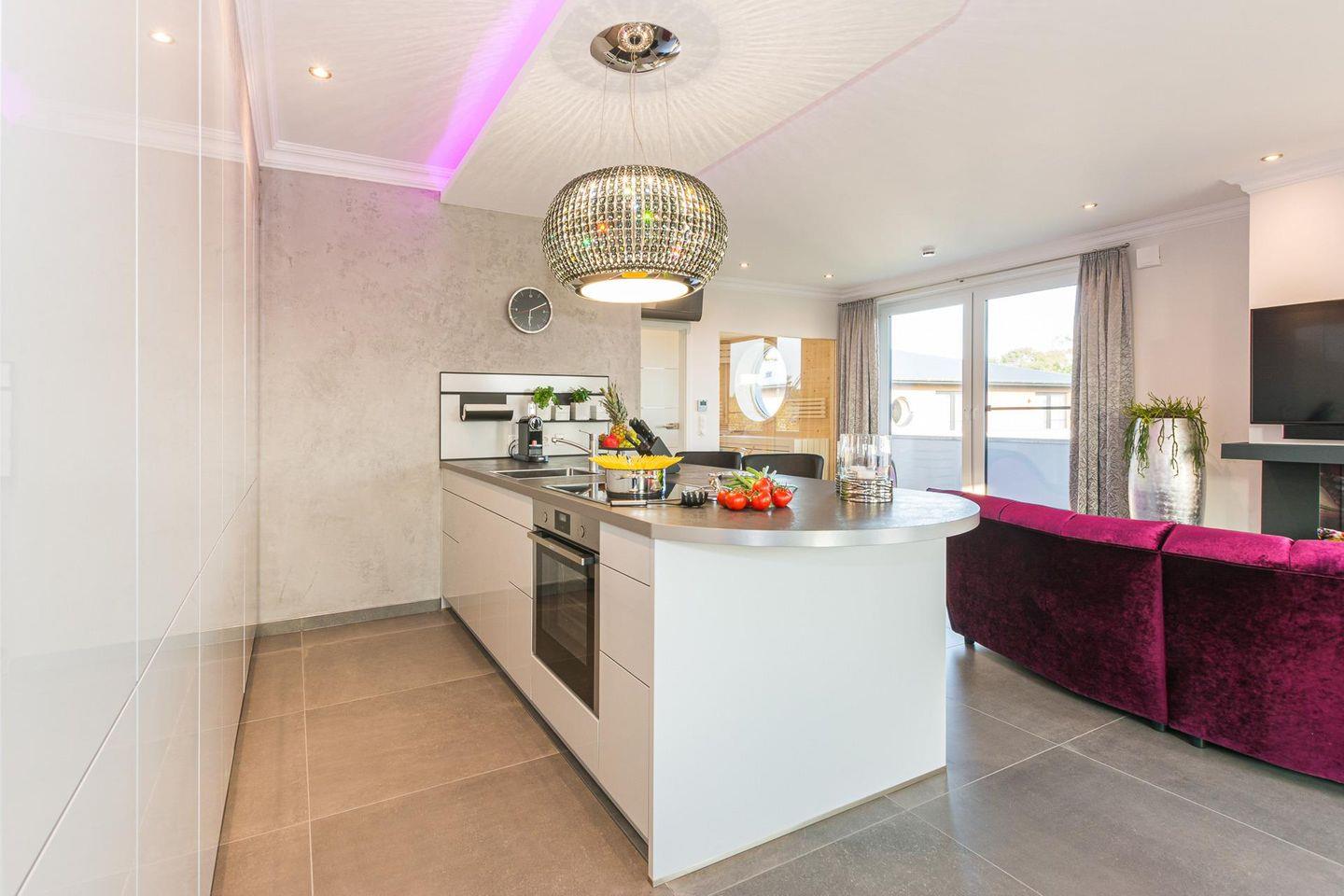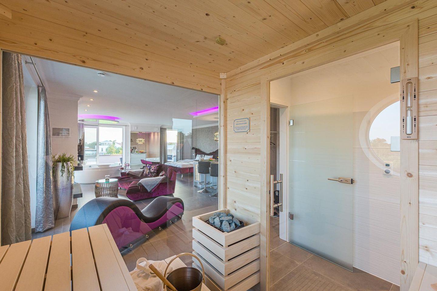 Das Apartment Dolce Vita im Obergeschoss vereint modernes Design mit luxuriösem Komfort und besticht durch Ihre hochwertige Ausstattung. Gönnen Sie sich ganz private Wellnessmomente in der Sauna, die ans Badezimmer anschließt, im Innen-Whirlpool oder vor dem Gaskamin. Der offene Wohn- und Schlafbereich ist mit stilvollen Möbeln, bequemer Couchgarnitur, großen Flachbild-TV und Design-Elementen ausgestattet, die eine perfekte Balance zwischen Eleganz und Gemütlichkeit schaffen. Die voll ausgestattete Küche bietet modernste Geräte wie Induktionsherd, Backofen, Mikrowelle, Spülmaschine und Kühlschrank mit Gefrierfach. Hier wird Kochen zum Vergnügen. Die Fußbodenheizung in der gesamten Wohnung sorgt für wohlige Wärme. Große Panoramafenster schaffen lichtdurchflutete Räume. Genießen Sie die frische Luft und den Ausblick auf der großzügigen Terrasse, die mit Sitzgelegenheiten und einem Grill, ausgestattet ist. WLAN und ein kostenfreier PKW-Stellplatz mit Ladestation für E- Autos steht Ihnen selbstverständlich zur Verfügung.
