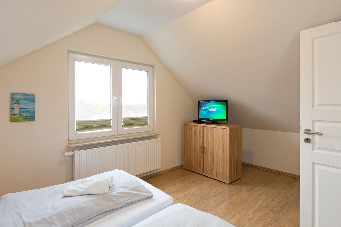 Im Obergeschoss befindet sich ein weiteres großes Schlafzimmer mit Doppelbett und TV.